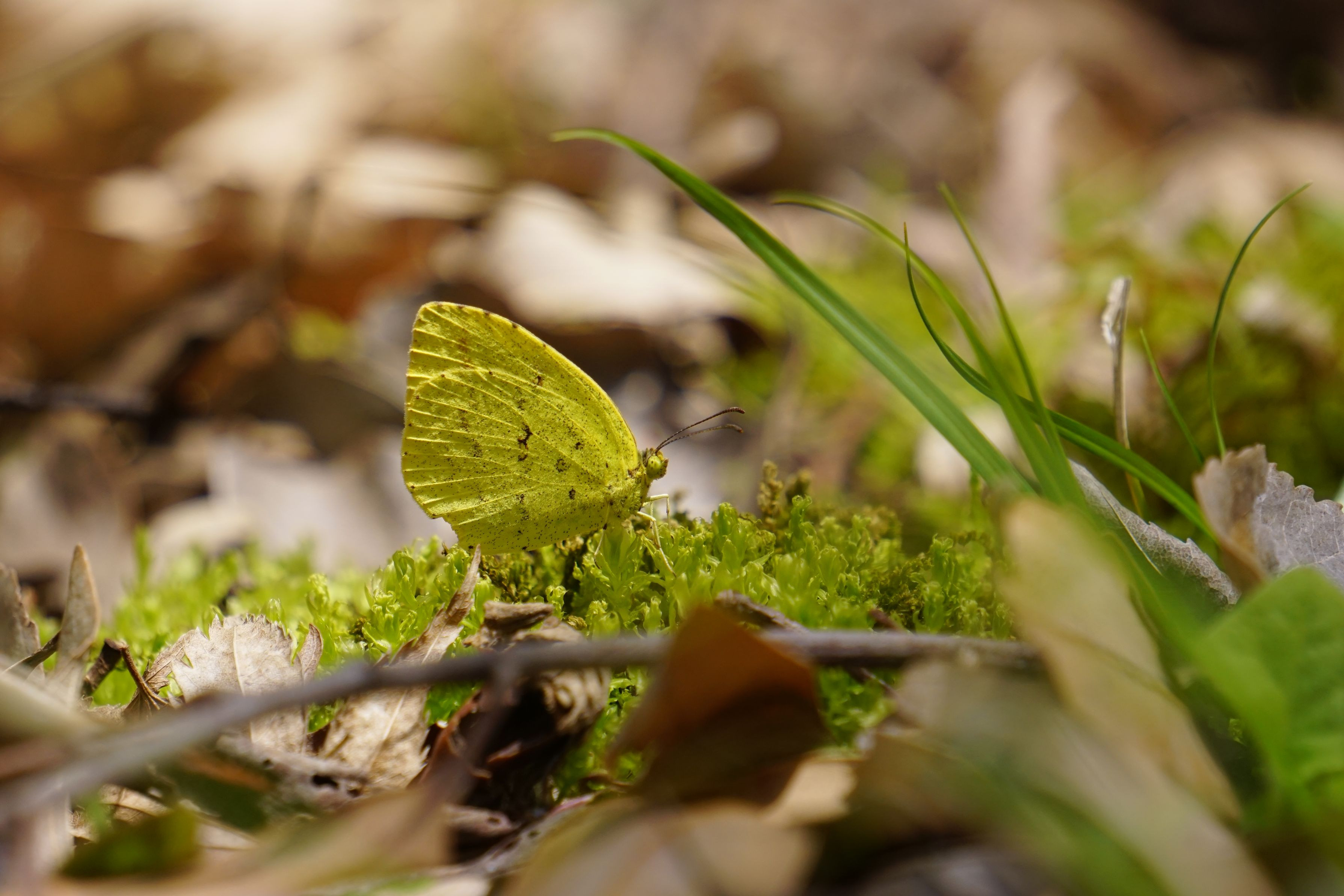 スミレの花でお食事をした後、コケの上でじっとしているキチョウ。