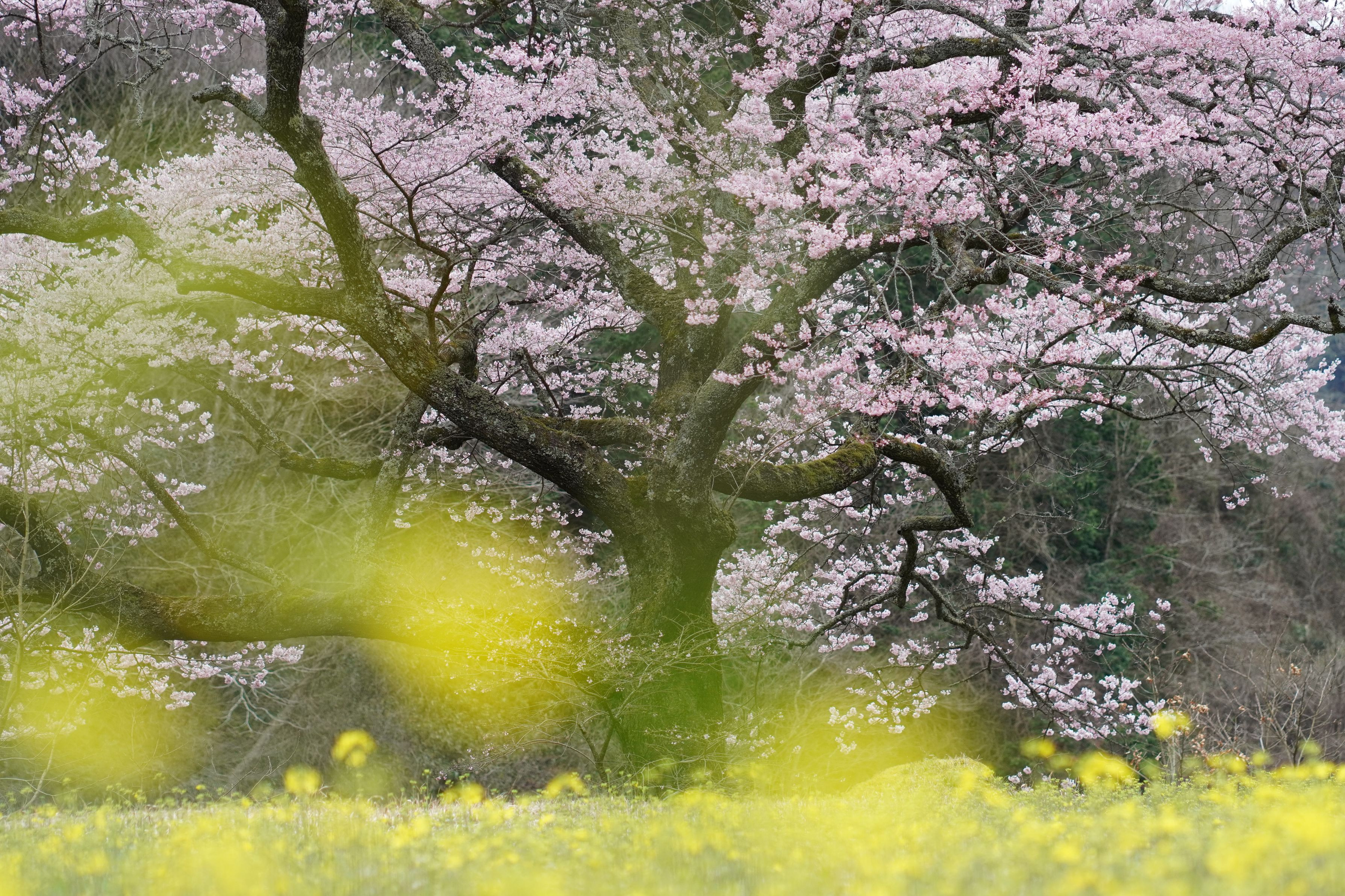 田舎にぽつんと1本だけ咲く桜。ピンク系で少し咲くのが早いのでヤマザクラ系かな。