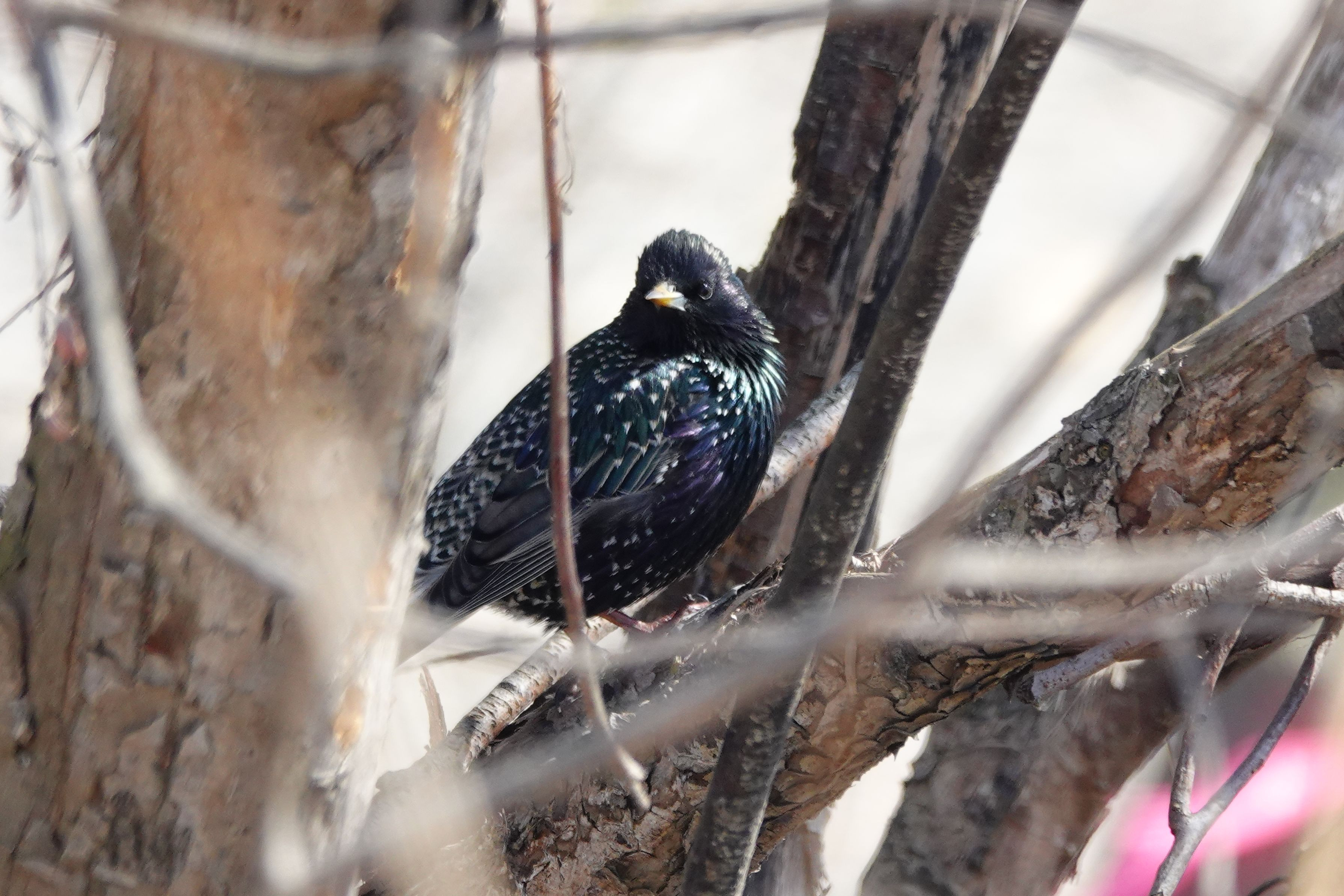 ここ数日お天気が良かったので、河川敷へ出かけてみたら、ムクドリに混じってホシムクドリがいました。 林の中で邪魔な枝が気になりますが、目が可愛い感じでしたので。