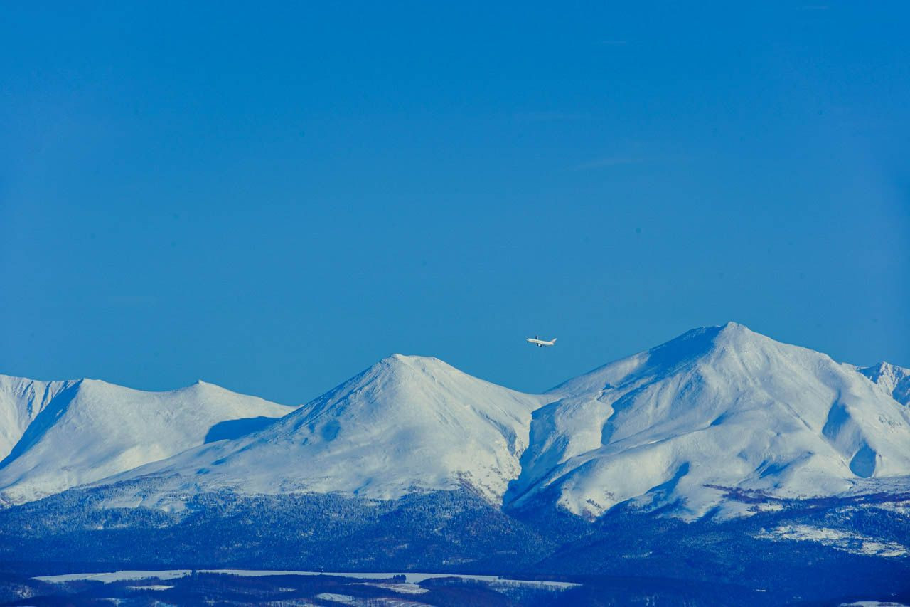 左旋回して旭川空港に着陸体制のJAL機、山は十勝岳連峰の美瑛富士と美瑛岳です。 この日は雲一つない快晴で窓側席は良い眺めだった事でしょう。