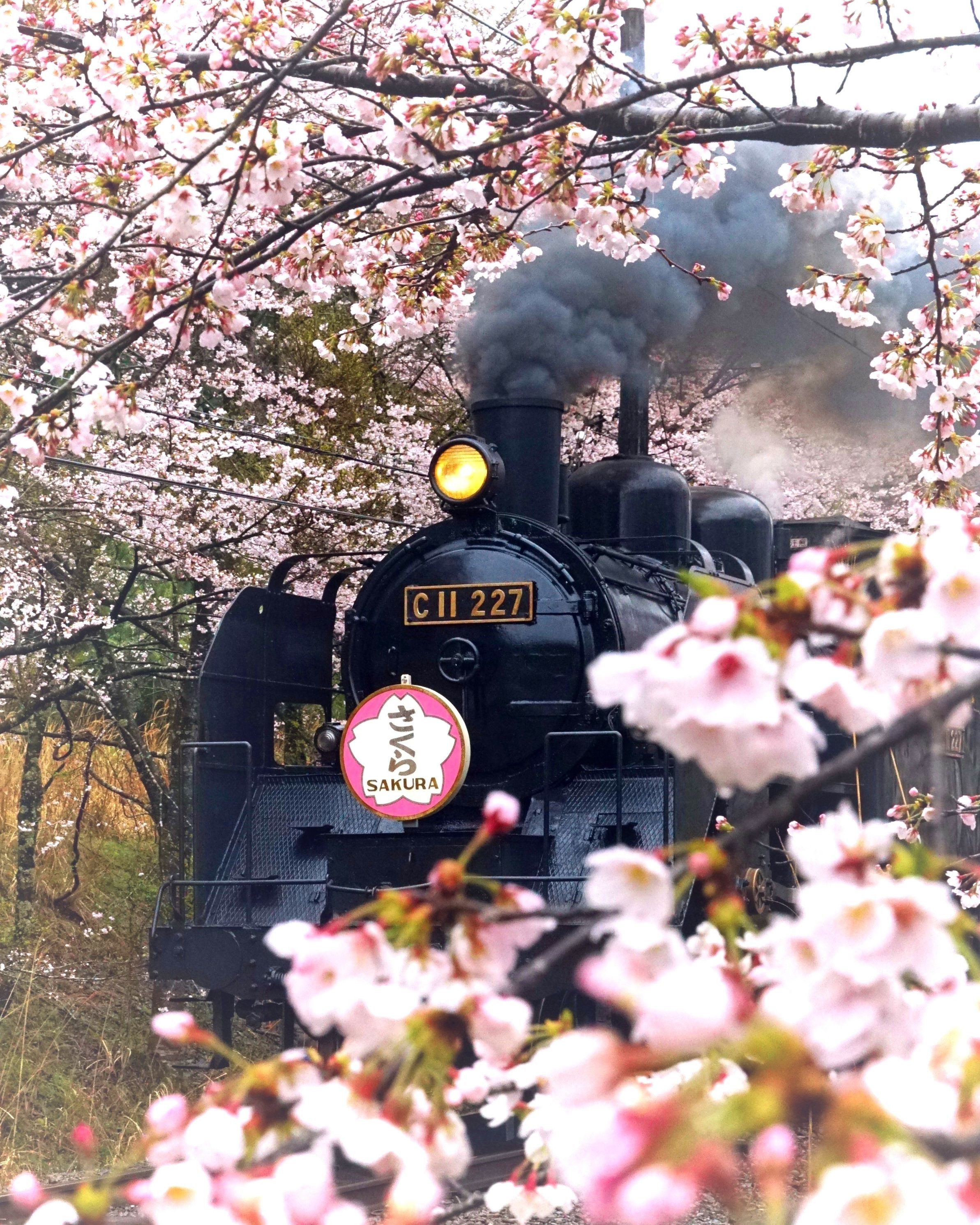 静岡の大井川鐵道のSLと桜の競演