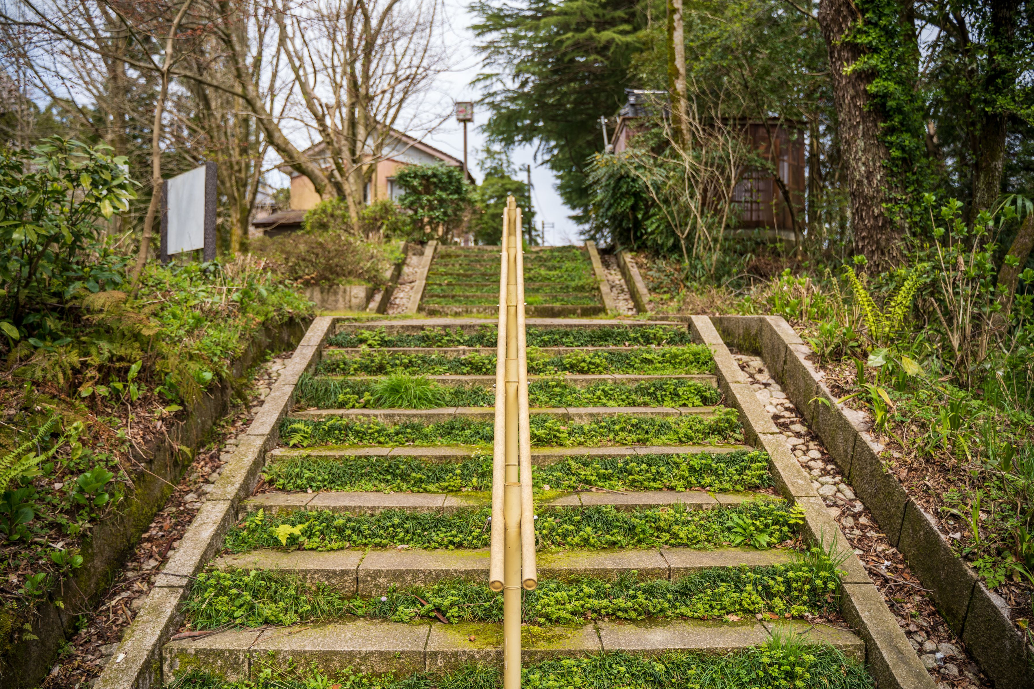 行田公園の階段です。 自然と調和が取れるように手すりが竹でいいセンスだと思います。