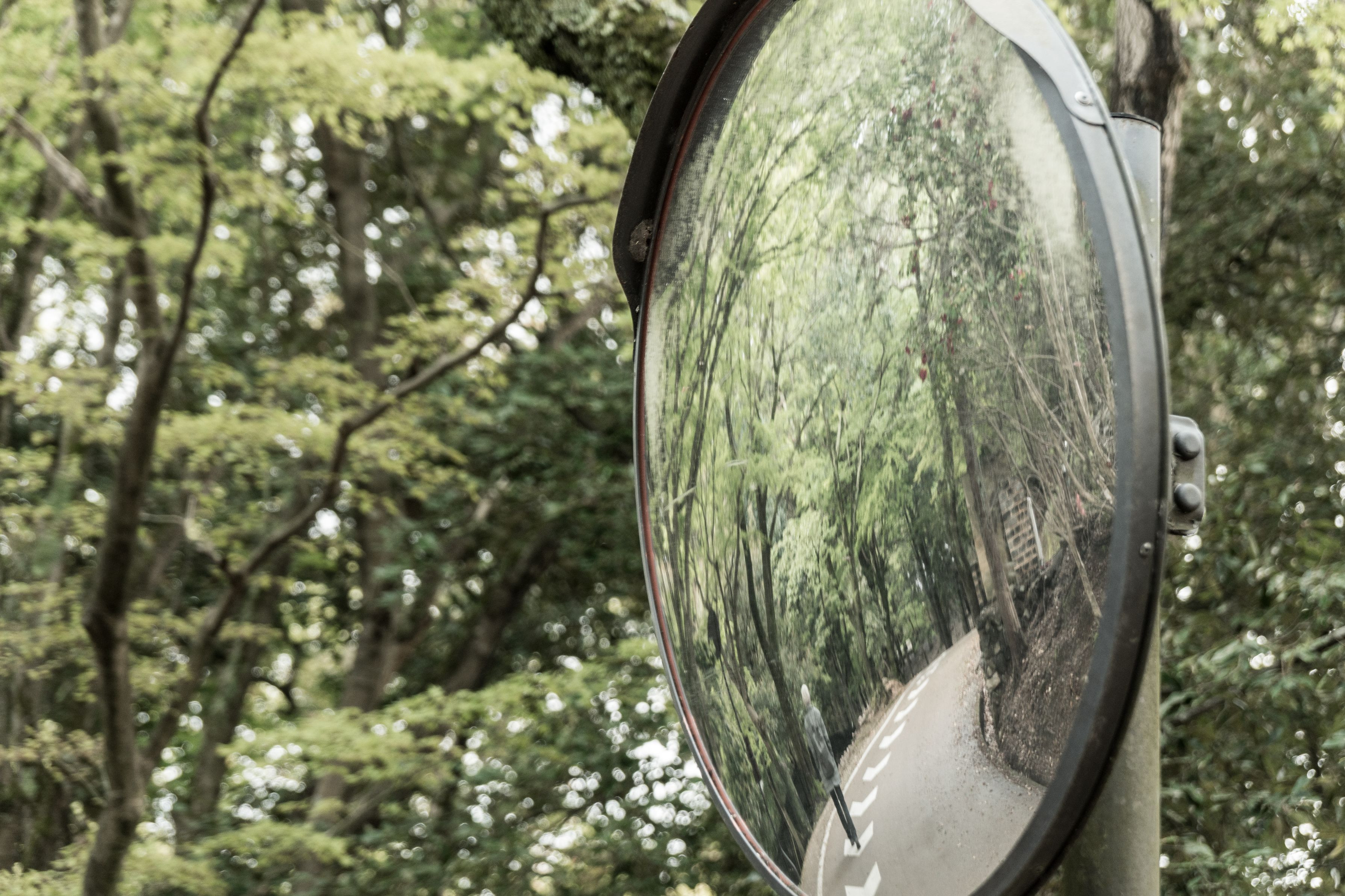 奈良公園内にある鏡に、面白い形で道が映っているのを発見し、車が来ない時を見計らって、撮影しました。