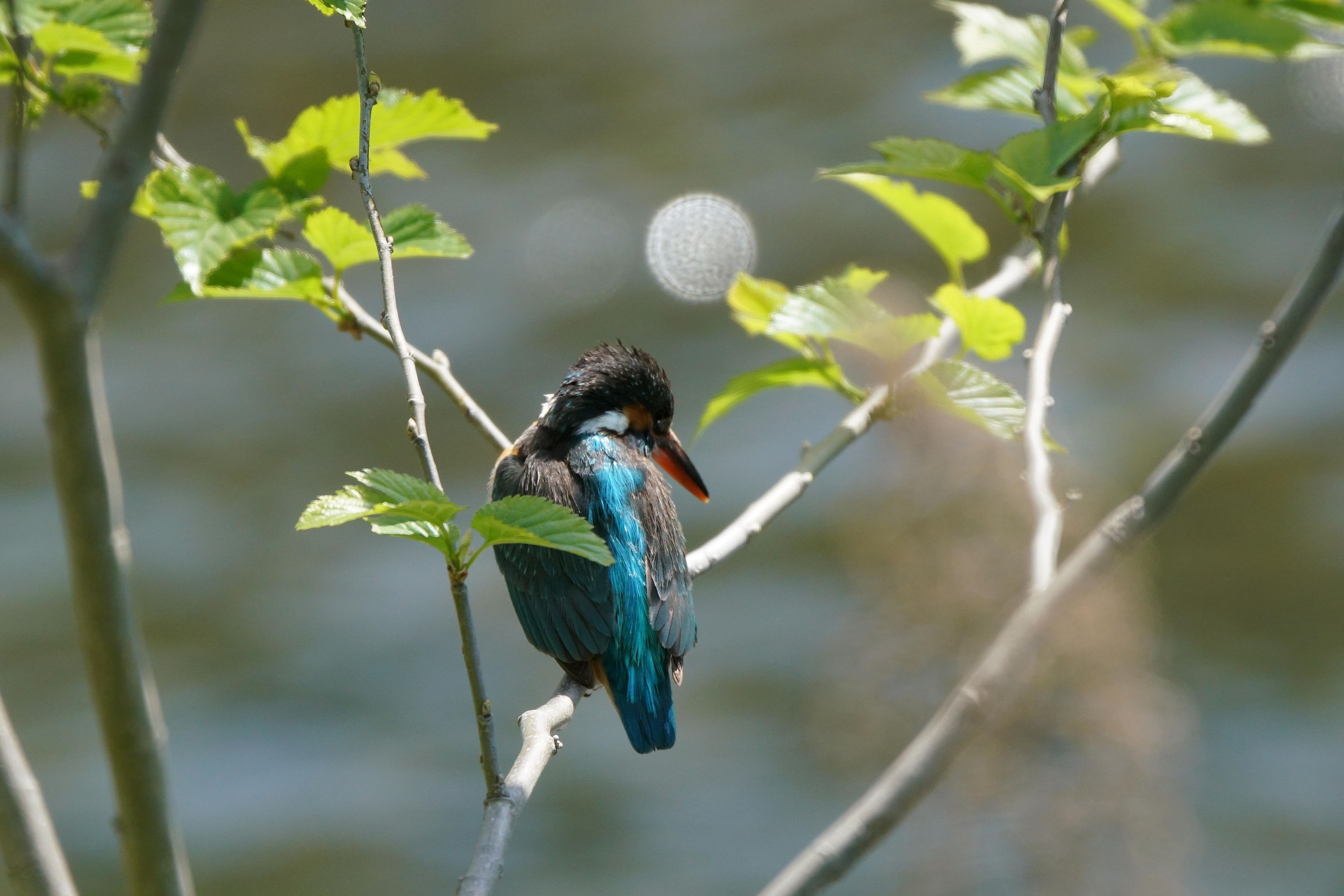 大雨の後、古巣にも、新しい巣穴にも寄り付きません。 近くにいた雄は魚を咥えて枝に叩きつけていましたが給餌に至らず。 雌は水面を狙っています。 水面は陽光で煌めいています。 #カワセミ##カワセミ#