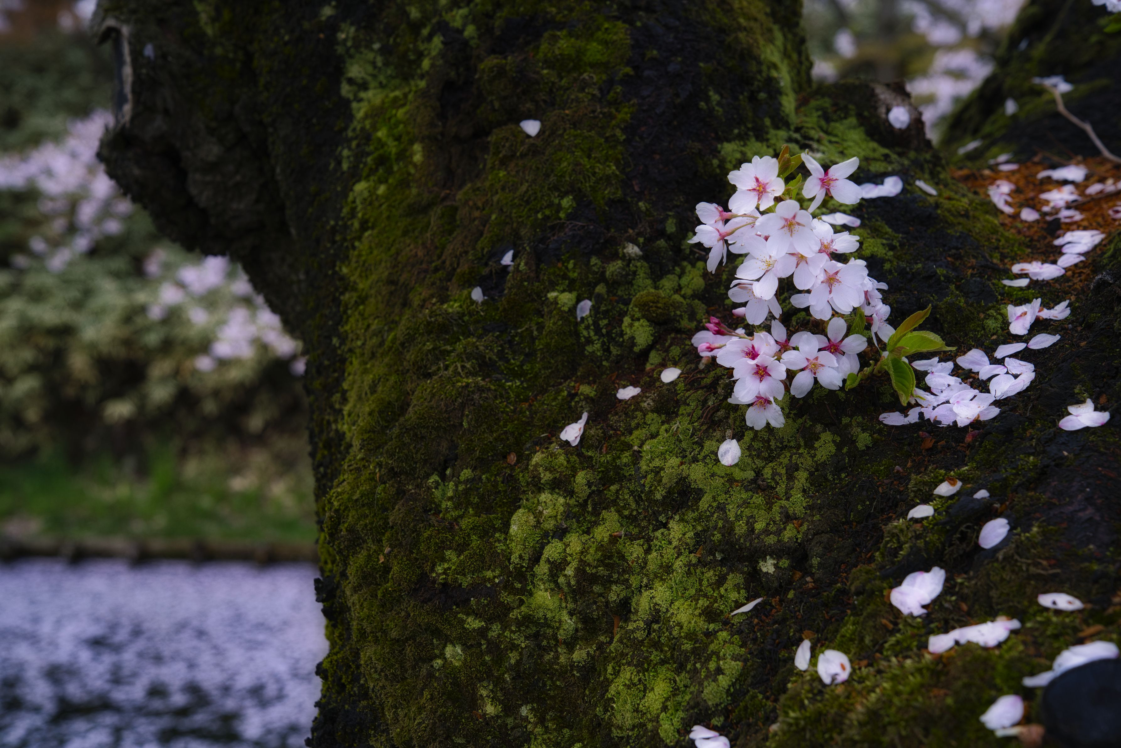 去年の桜です、満開の幹の隙間にひっそりと咲いていました