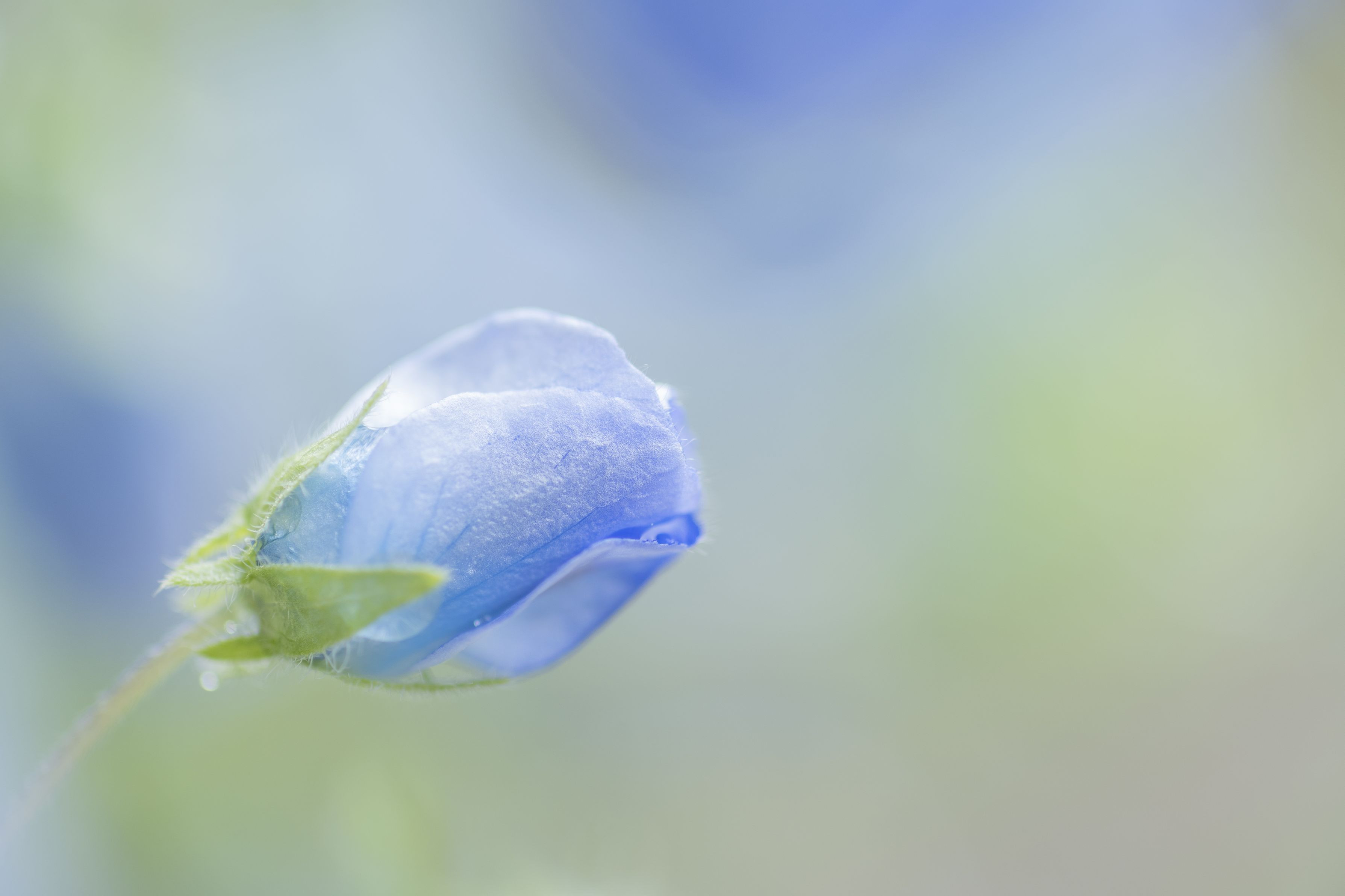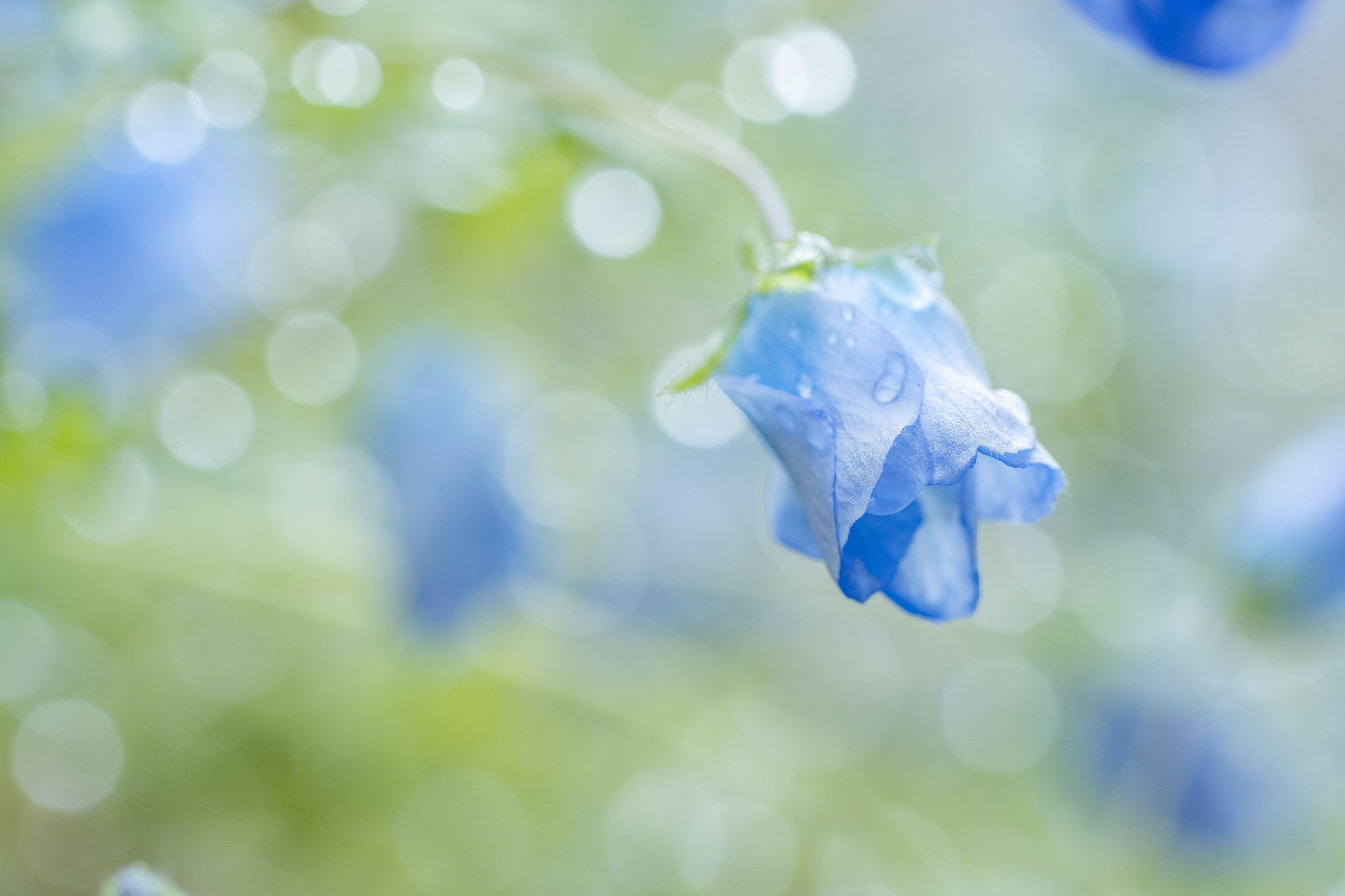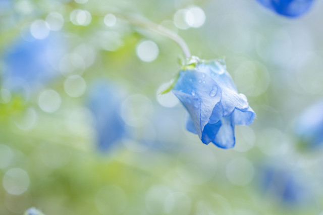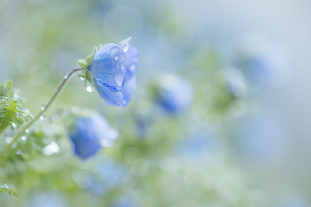 雨上がりの庭、鉢植えのネモフィラが朝日に輝いていました。