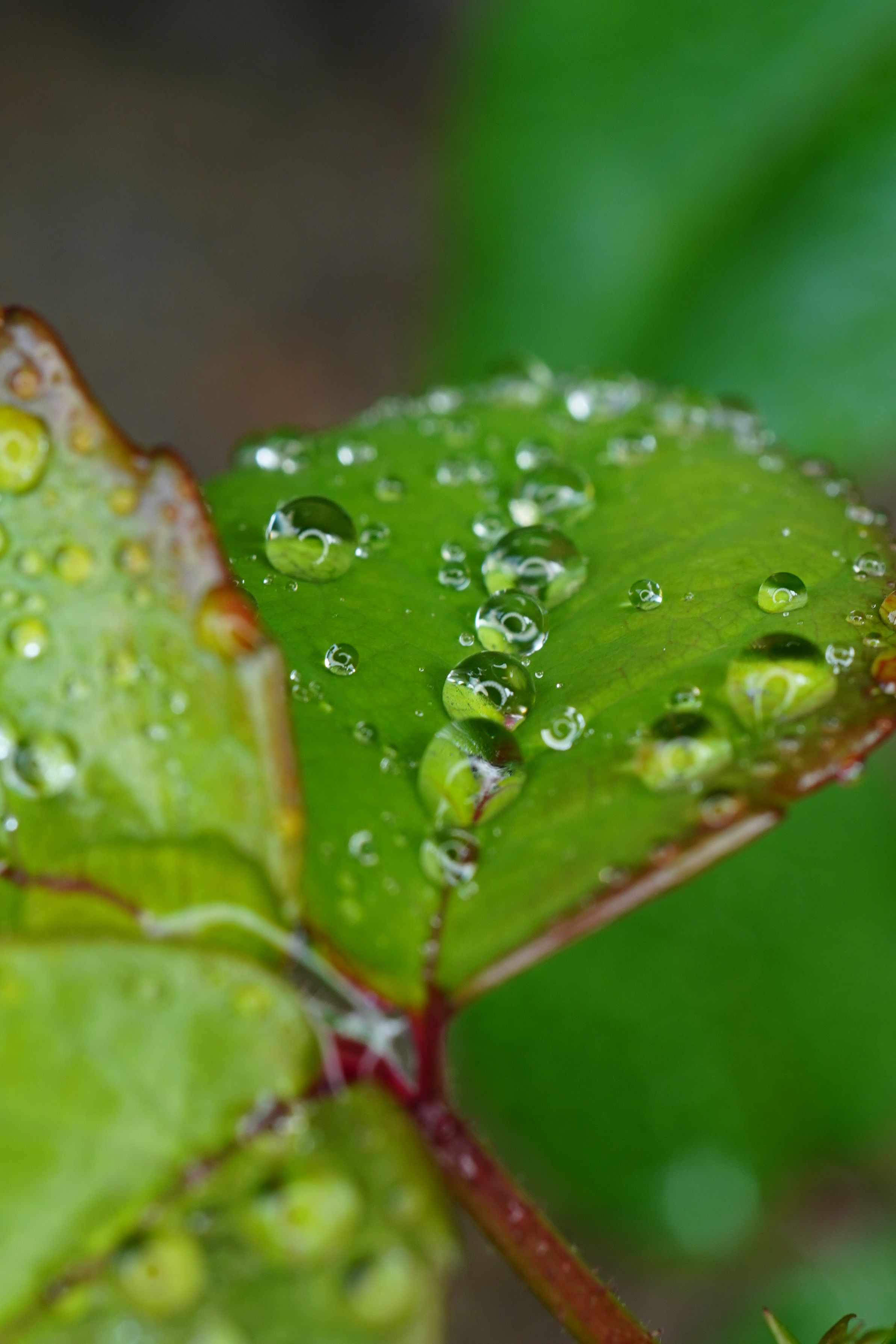 バラの新芽に今朝降雨した美しい水珠達。