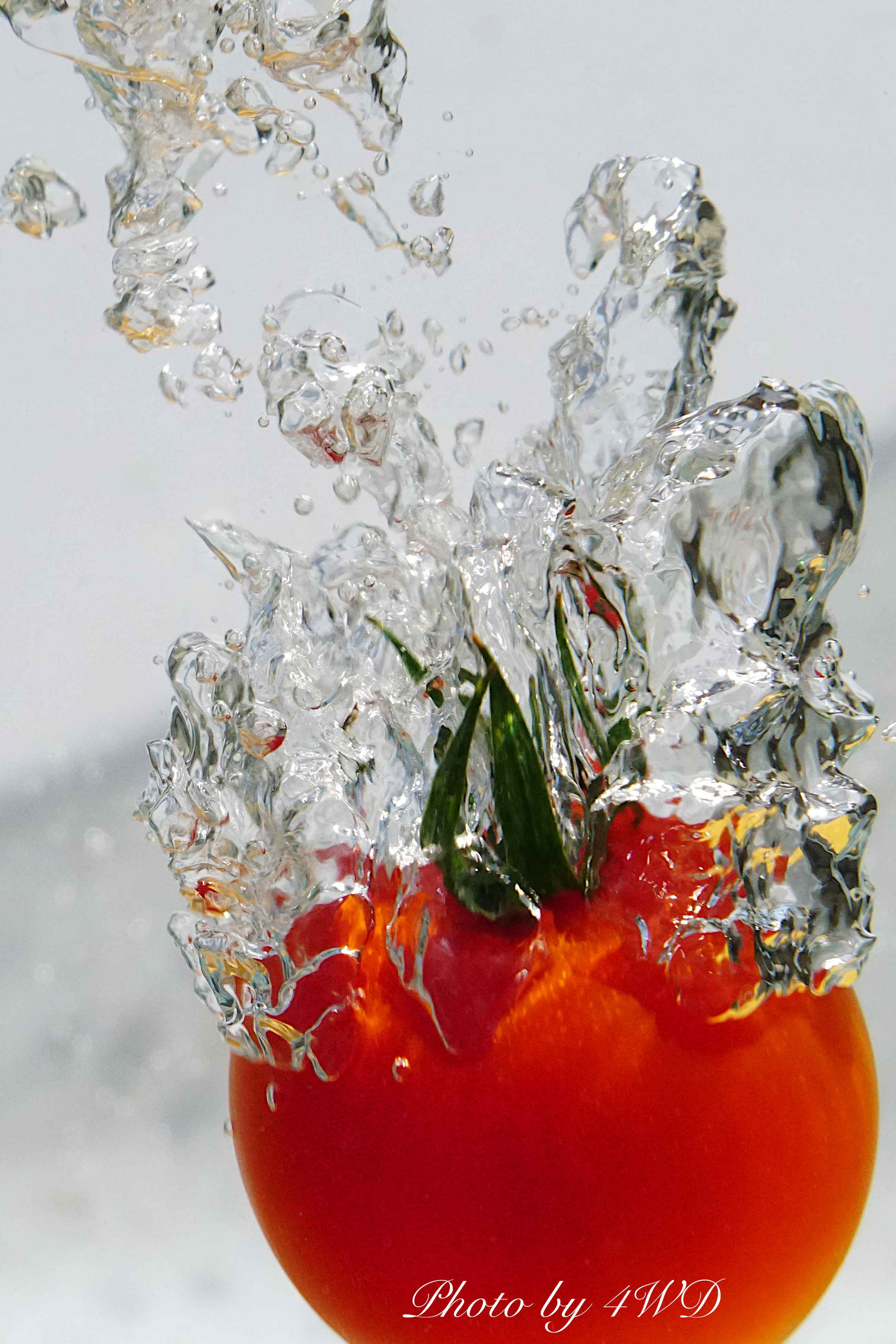 ミニトマトを水中落下させ、その時できる泡が硬質な感じに撮れました。 真っ赤な球からめらめらと立ち昇るようなその泡をメインに、横構図の左右をカットして縦構図にしました。