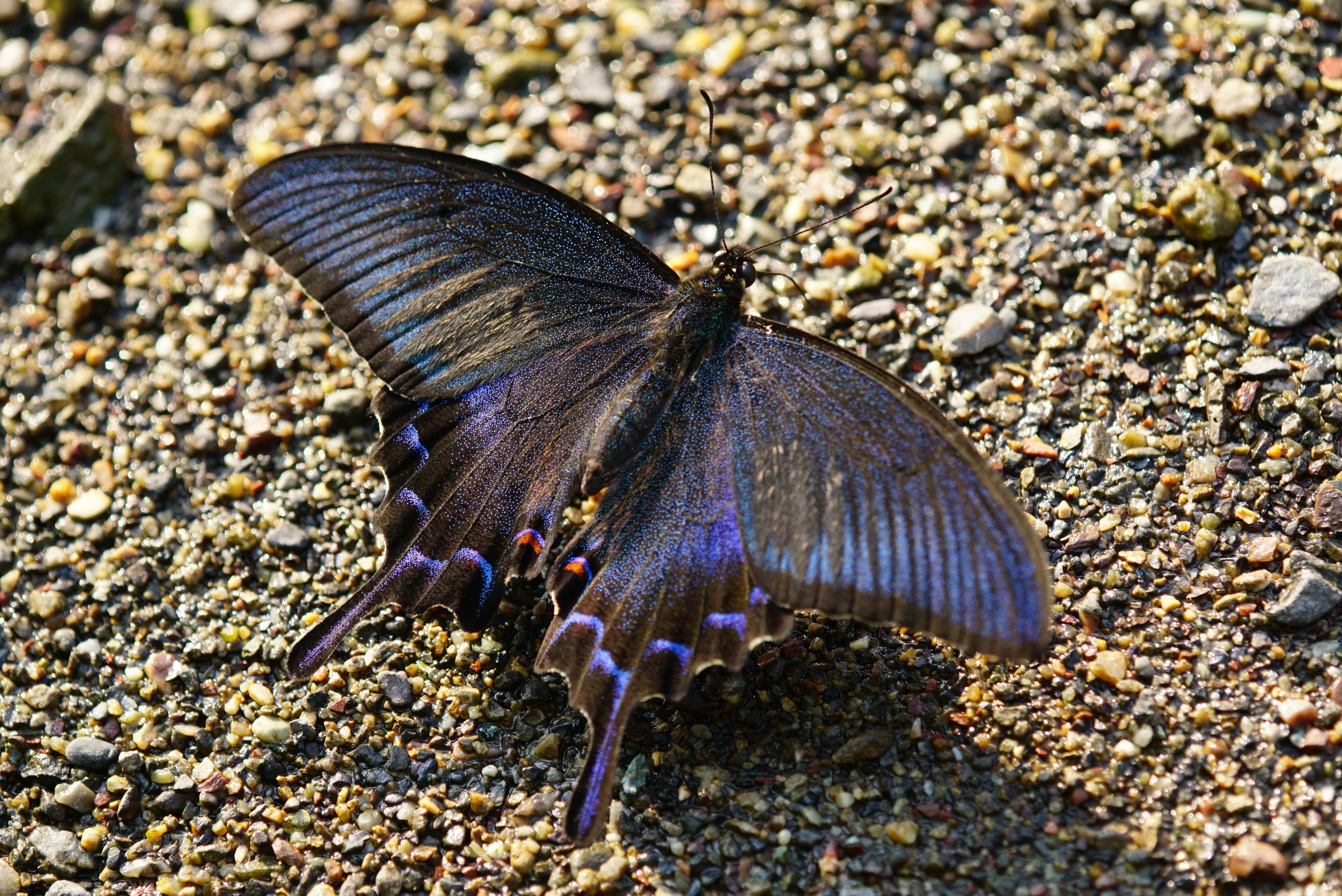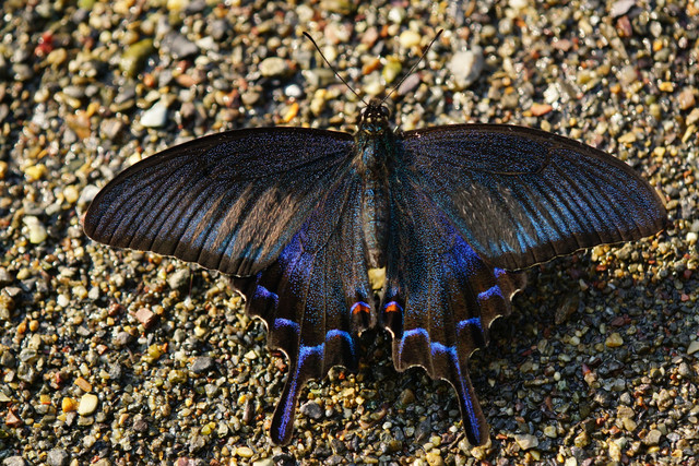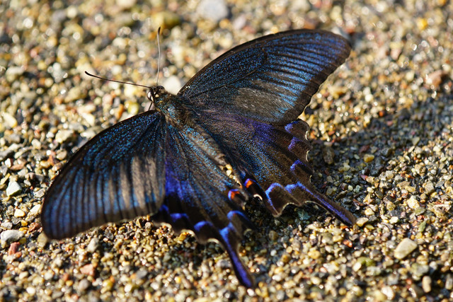 蝶の水飲み場にやってきたカラスアゲハ・春型の♂。順光に近い状態で西日を浴びると、Part1とはまた異なった輝きで魅了してくれます。
