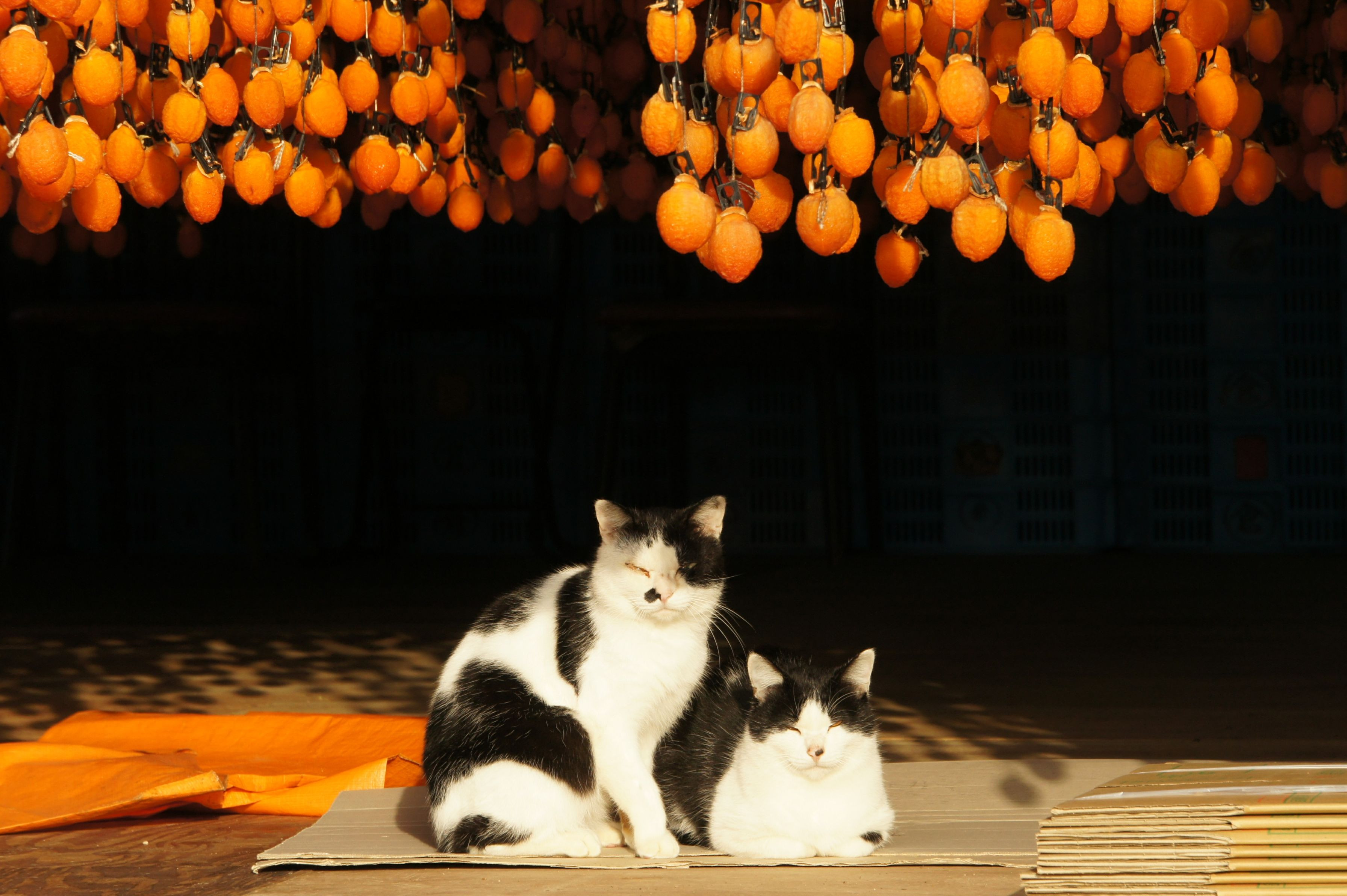 早朝、偶然通りかかった柿すだれの下、2匹の猫が気持ち良さそうにひなたぼっこをしていた。2018年11月 また出会いたい風景です。