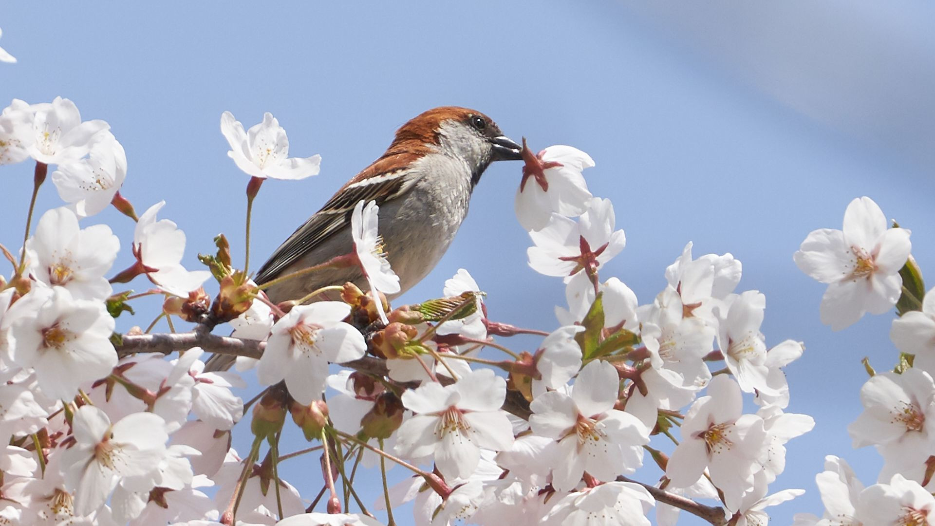 北海道江別市の公園で撮影しました(2020年5月9日)。ニュウナイスズメが桜の木に止まり、花を咥えていました。