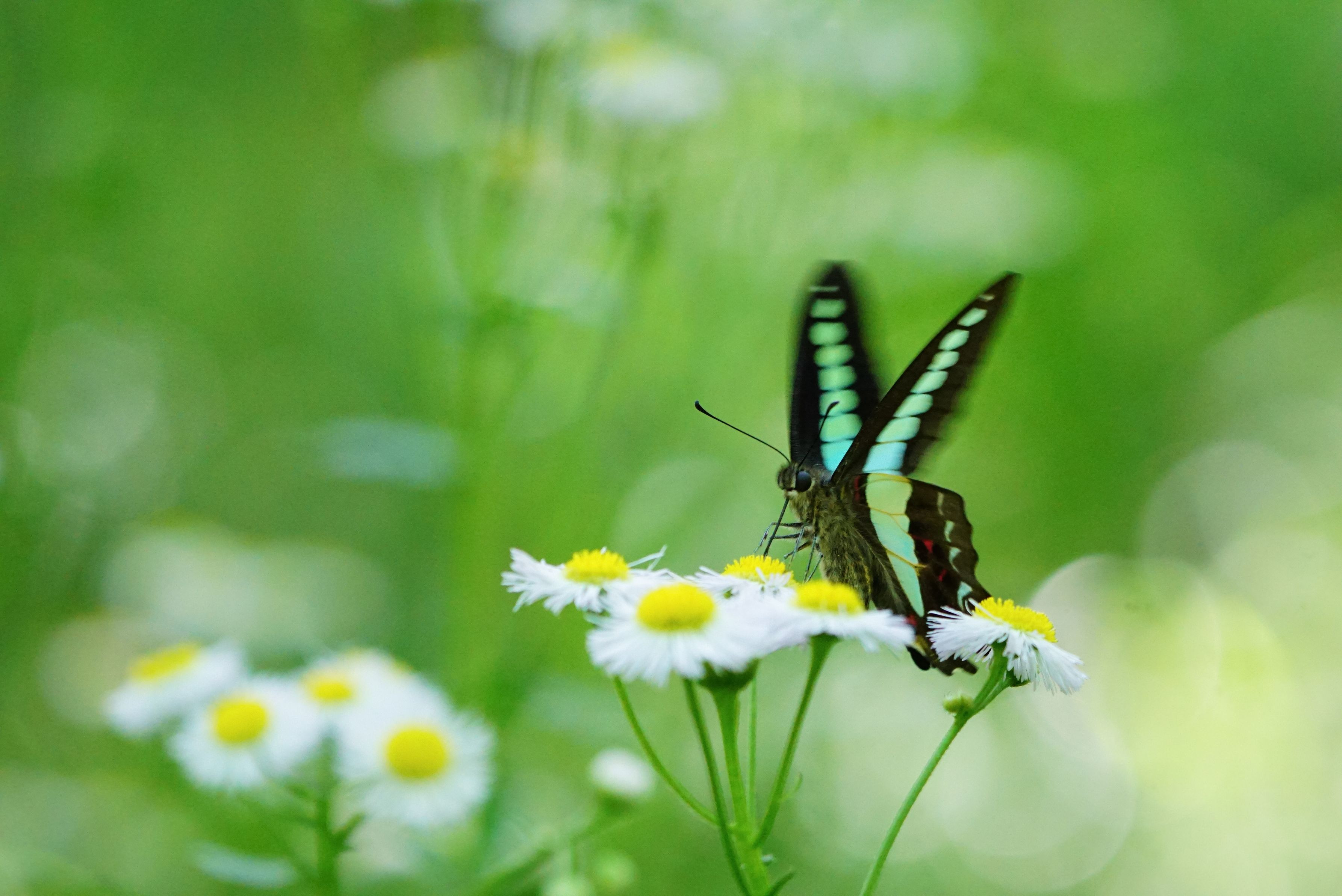 ヒメジョオンで吸蜜のアオスジアゲハ、 午後2時頃でも森の中はちょっと暗いんですょ・・
