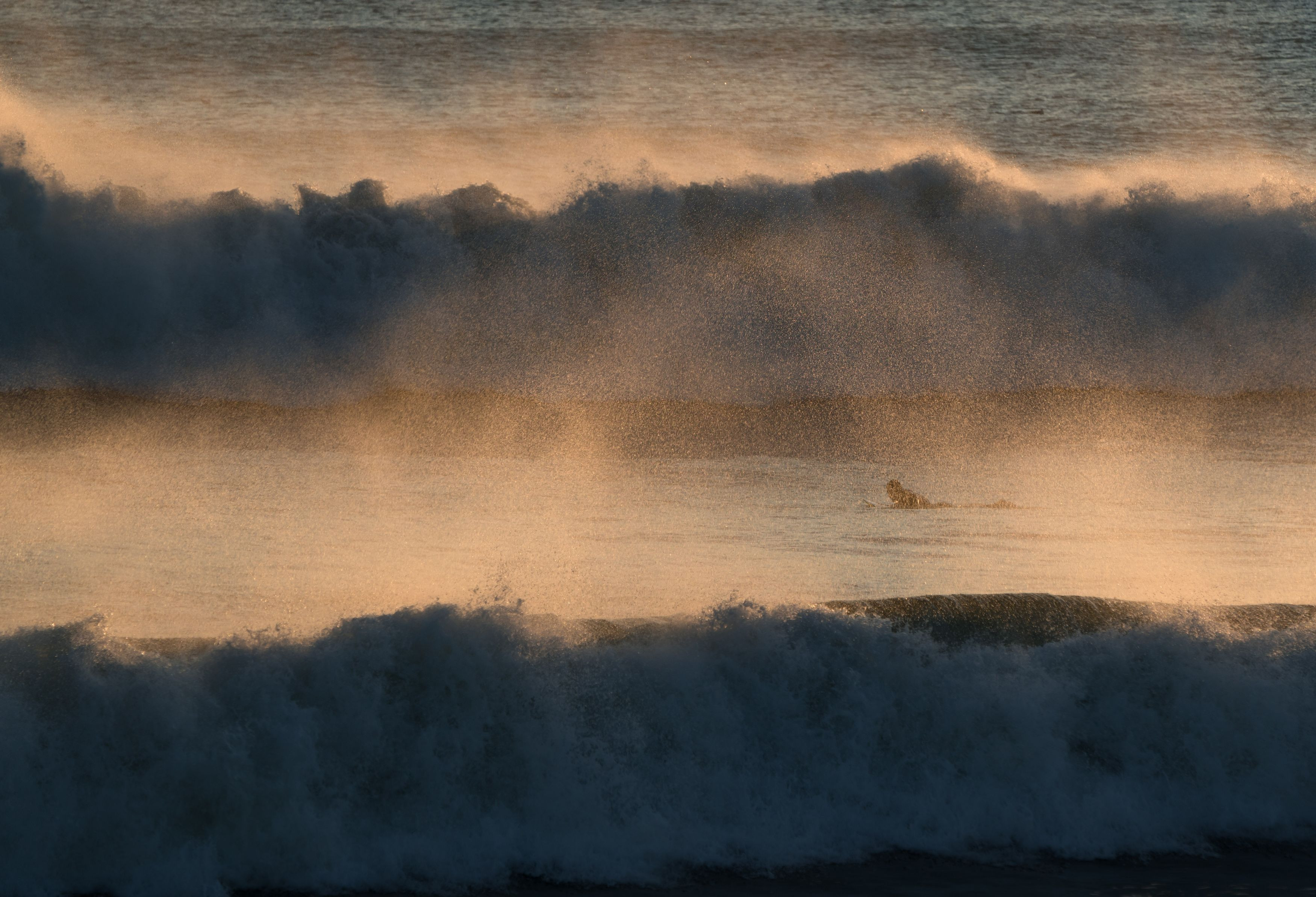 稲村ケ崎の沖、夕日に染まる波飛沫の中、 サーフポイント目指して進む、一人ぼっちのサーファーがいました。 (蔵出し写真です)