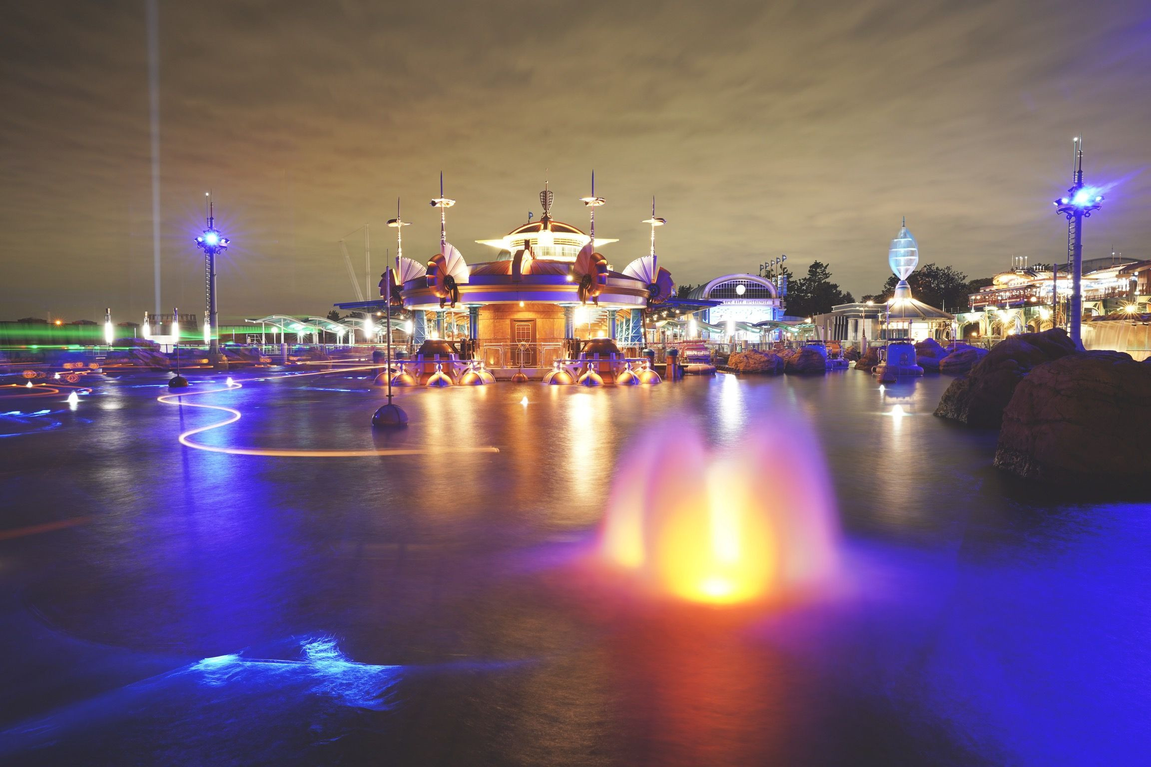 初めての投稿です!! 東京ディズニーシーのポートディスカバリーエリアで撮影しました! 手間にあるのはアクアトピアというアトラクションで、水上に自動走行のビークルに乗り予測不能な動きが魅力的です。 夜になるとビークルや噴水、滝など様々な場所がライトアップされます。 普通に撮るだけでも綺麗ですが、ちょっと工夫してシャッタースピードを遅くすることにより写真の印象が変わります!
