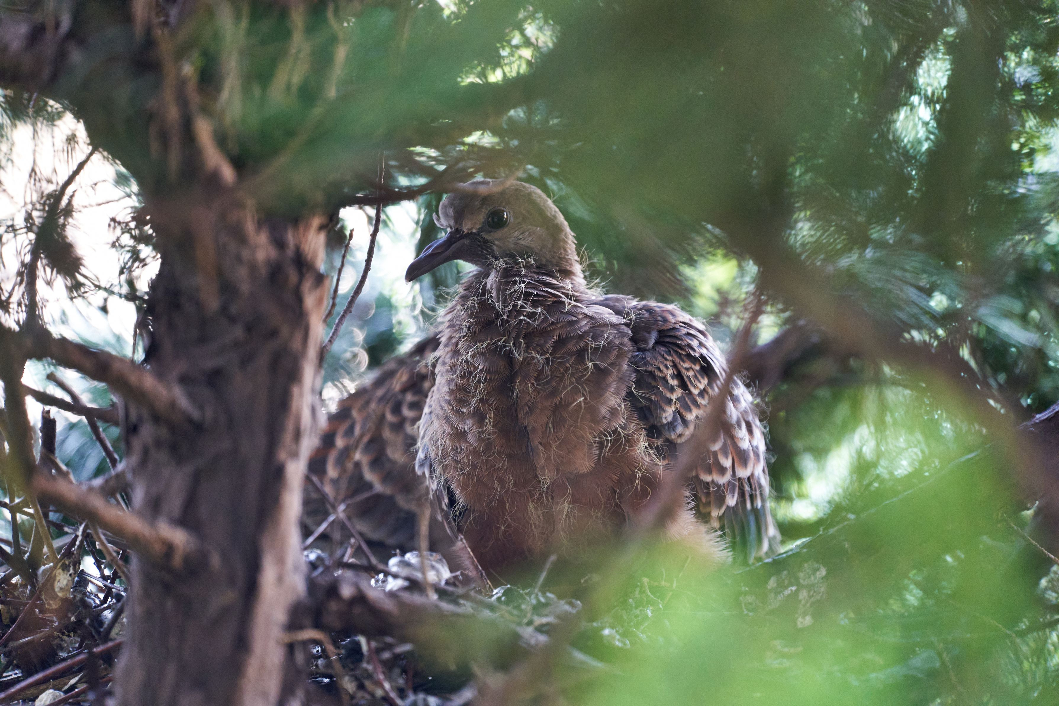 #キジバト# 今日は巣立ちそうな予感がして、朝から観察してました。 朝7時ごろに親から餌をもらった後、二羽とも巣から木の枝に移動し、今にも飛び立ちそうだったのですが、外の車や人の声に警戒したのか、また巣に戻ってしまいました。 いよいよ明日は巣立ちかな?