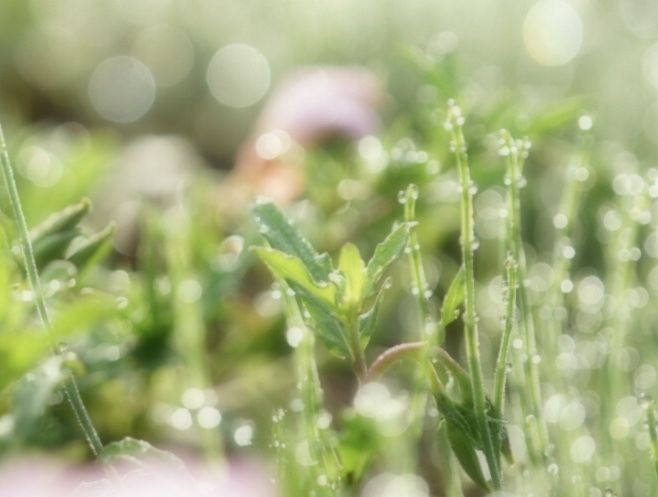 早朝、畑の様子を見に行った時に、朝露の光を放つ草花に見惚れました。
