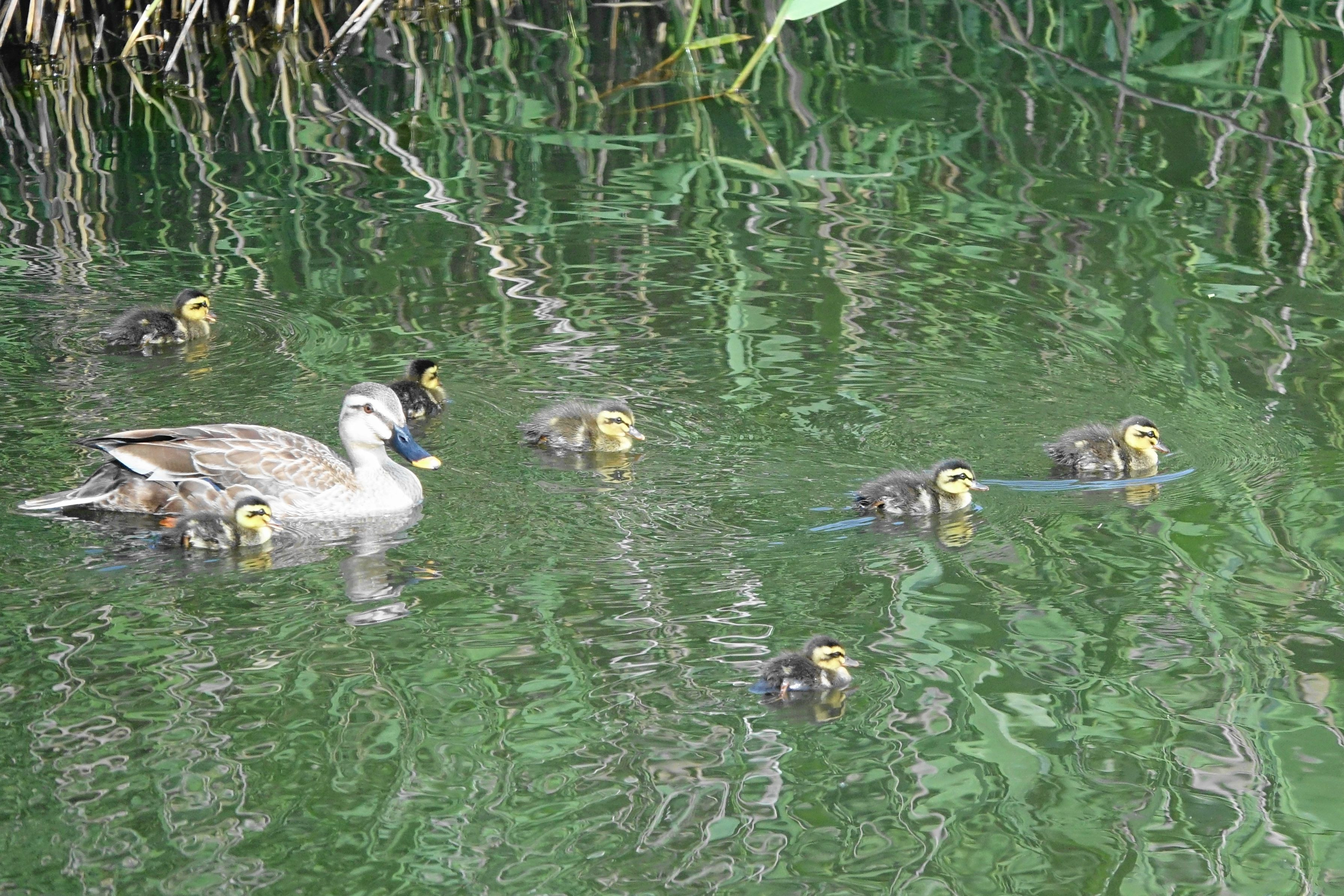 毎日散歩へ行ってますM池で本日(6/05)6羽のカルガモが生まれました。M池には5日前に生まれた2羽のヒナが残っており、6羽のお母さんカルガモが代理に育てようとしています。無事に8羽育つことを祈ります。