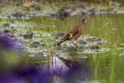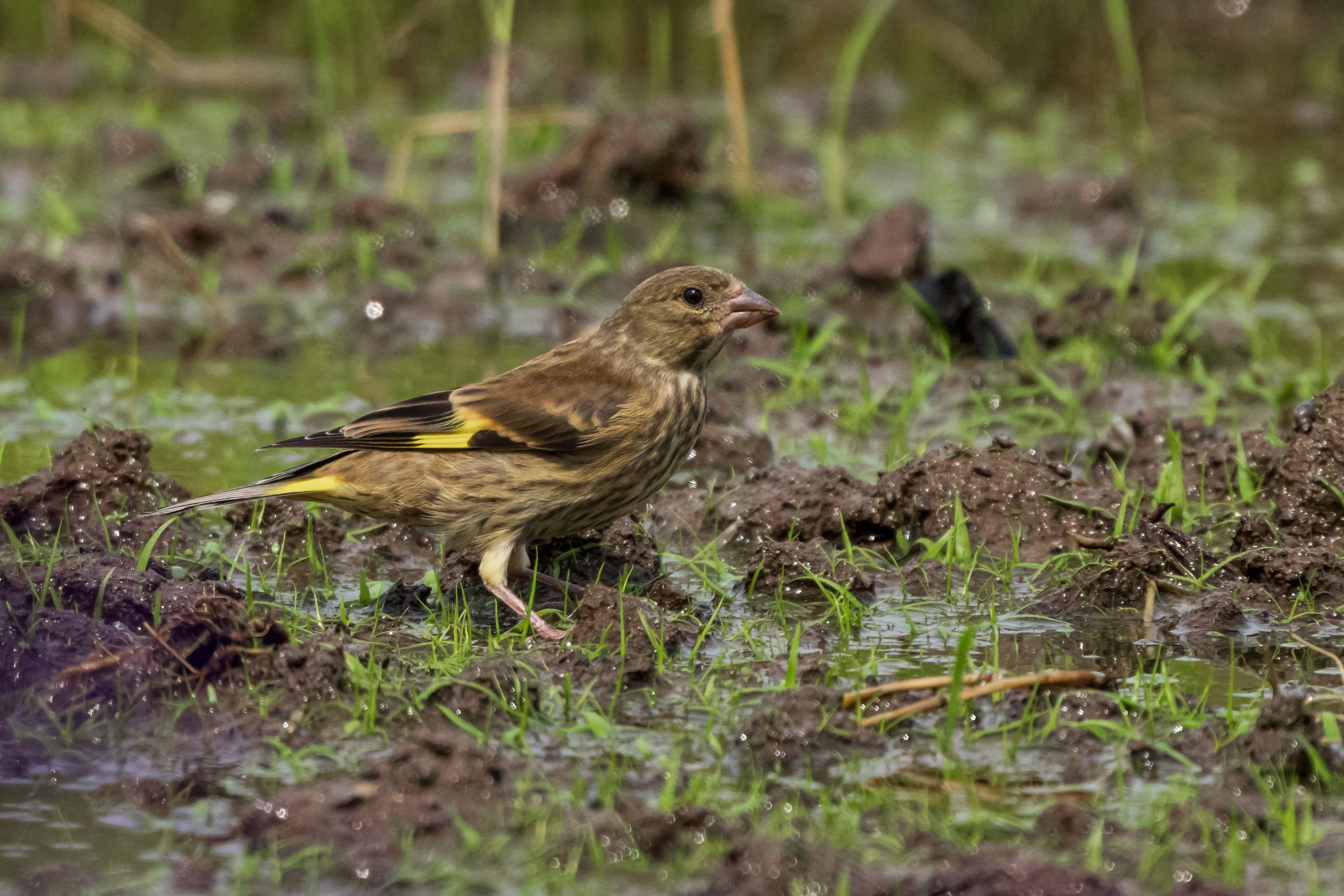 コアジサシを待っていると背後が鳥の鳴き声で騒がしい。道路を挟んだ田んぼ?に数羽のスズメと3羽のカワラヒワが飛来していた。最初に狙った鳥さんはちょっと変わっていた。「なんだろ?」と思ったが、この時点では推測だが幼鳥だという事に気が付いた。帰宅後調べると、確かに幼鳥で間違いなさそうだ。#カワラヒワ#