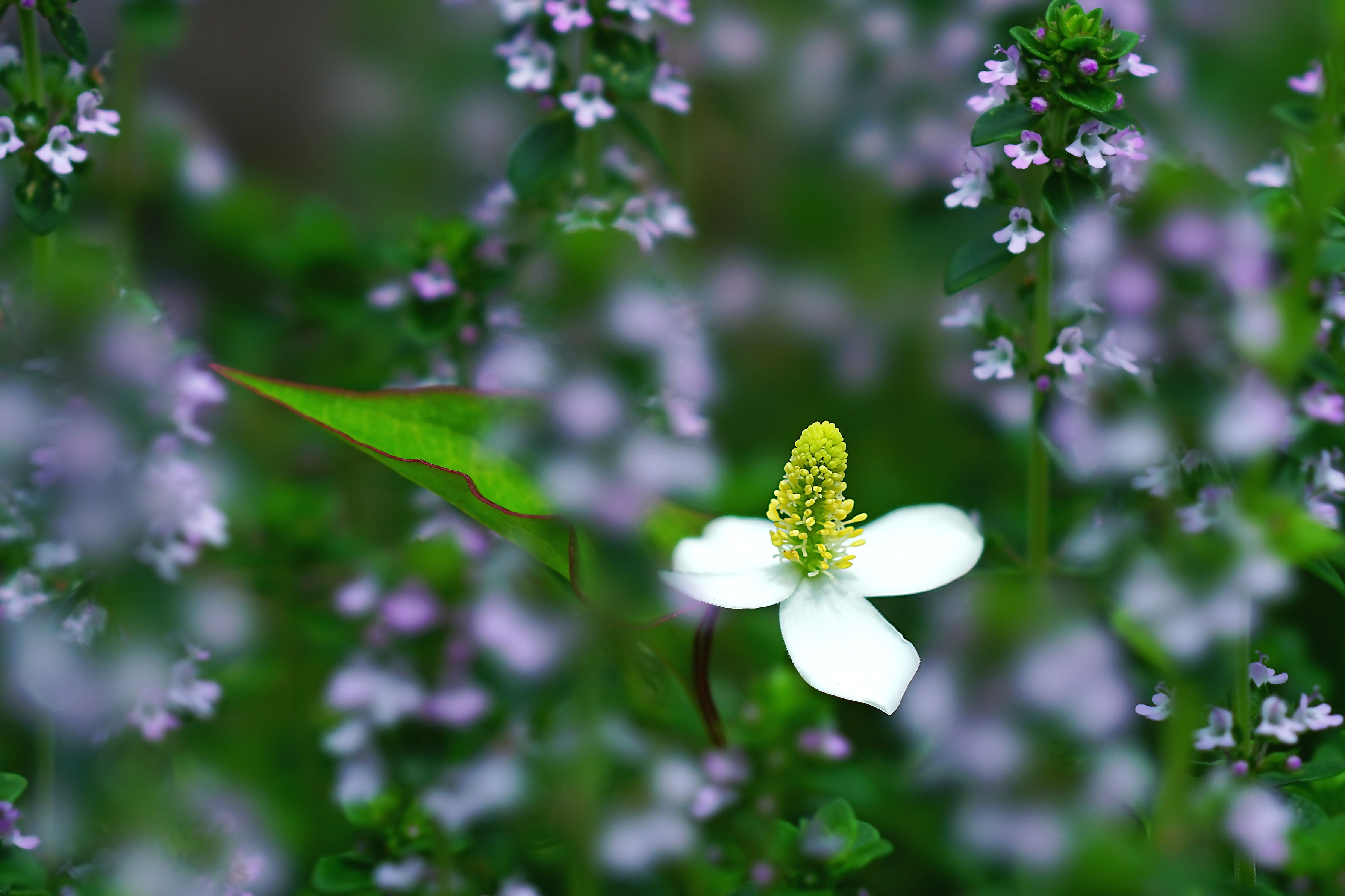ハーブ(レモンタイム)畑にドクダミが一輪だけ咲いていました。