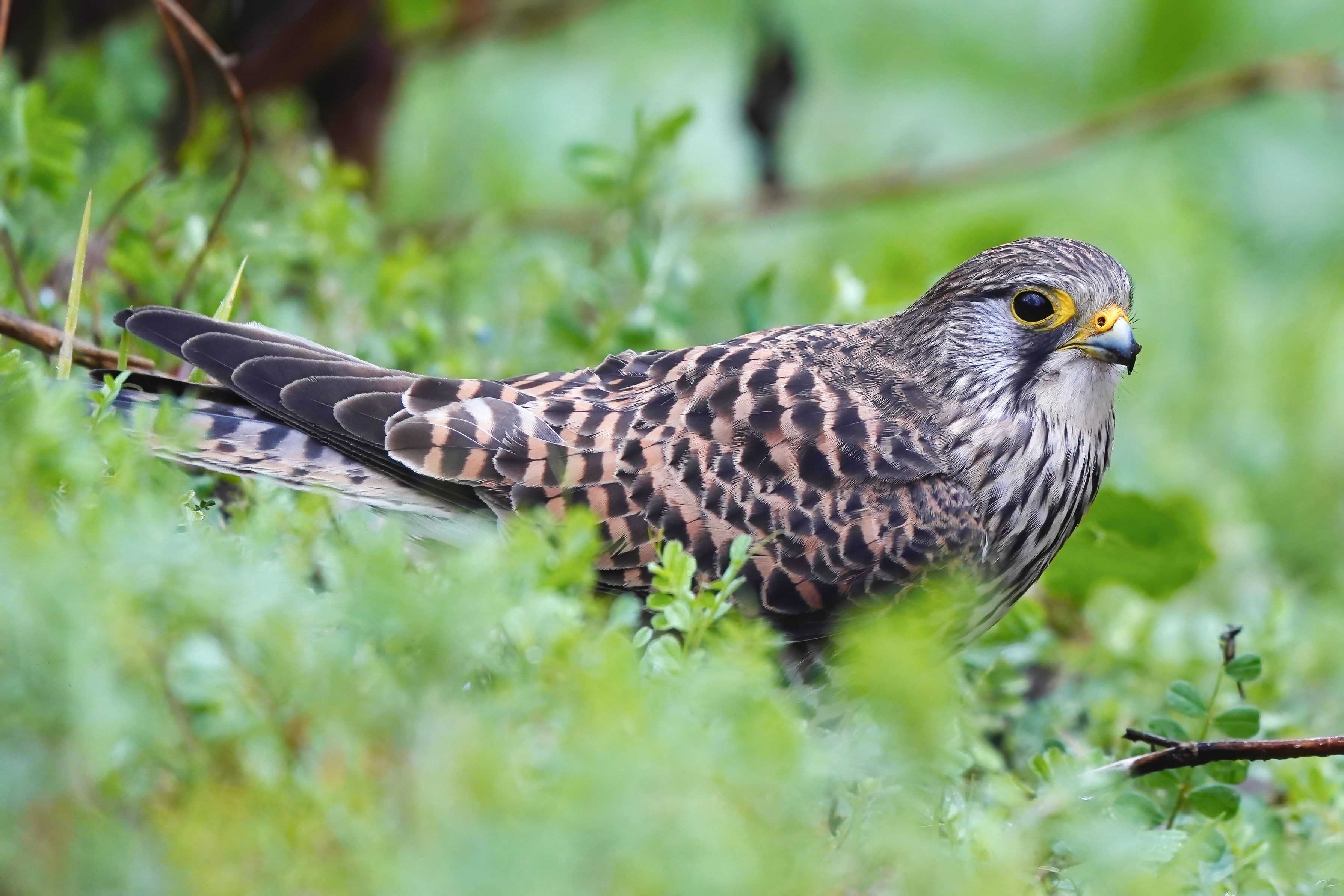 チョウゲンボウが目の前に降り立った どうやら土の中のおやつを探しているようだ