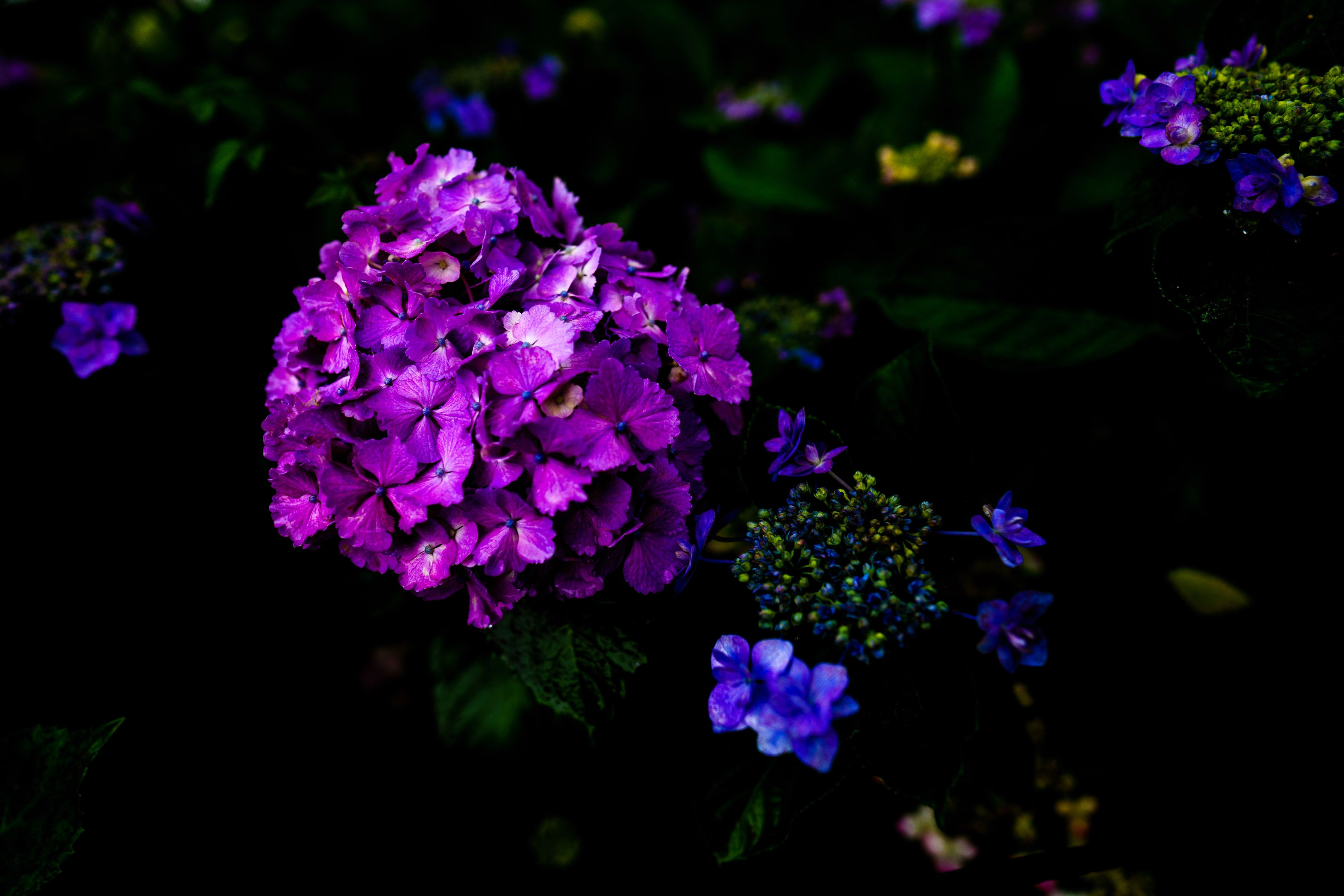 暗闇に浮かび上がる紫陽花を表現してみました。