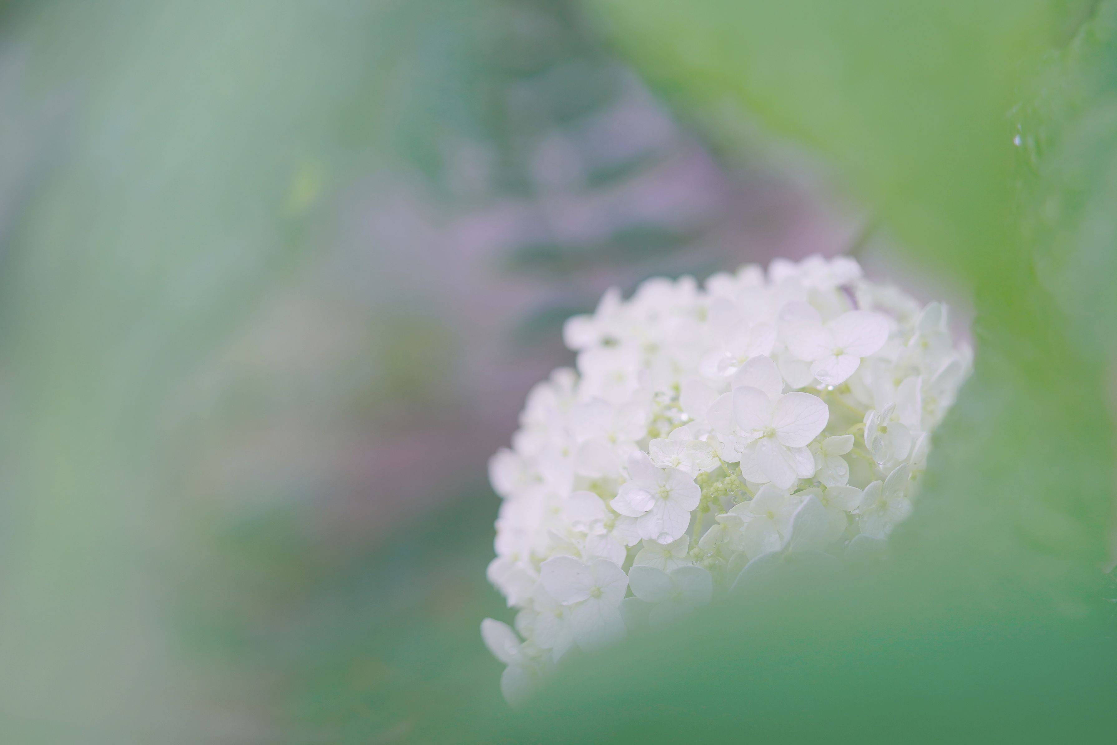 梅雨はアジサイ、中でもダントツ一番私が撮りたいのはこのアナベル。 ツボミから追いかけましたが、納得がいったのは白さを誇る満開時。シミや汚れが付いたらもう…。今年は、降り始め雨のこの日がラストでした。翌朝はもう雨の重さに耐えかねたのか、うなだれていました。