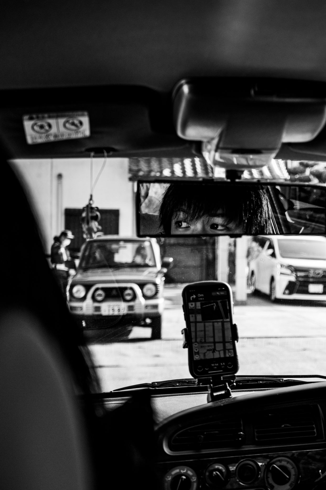 駐車場から出発する際の一枚。ルームミラー内に切り取られた眼差しに異質な雰囲気を感じたので撮影しました。