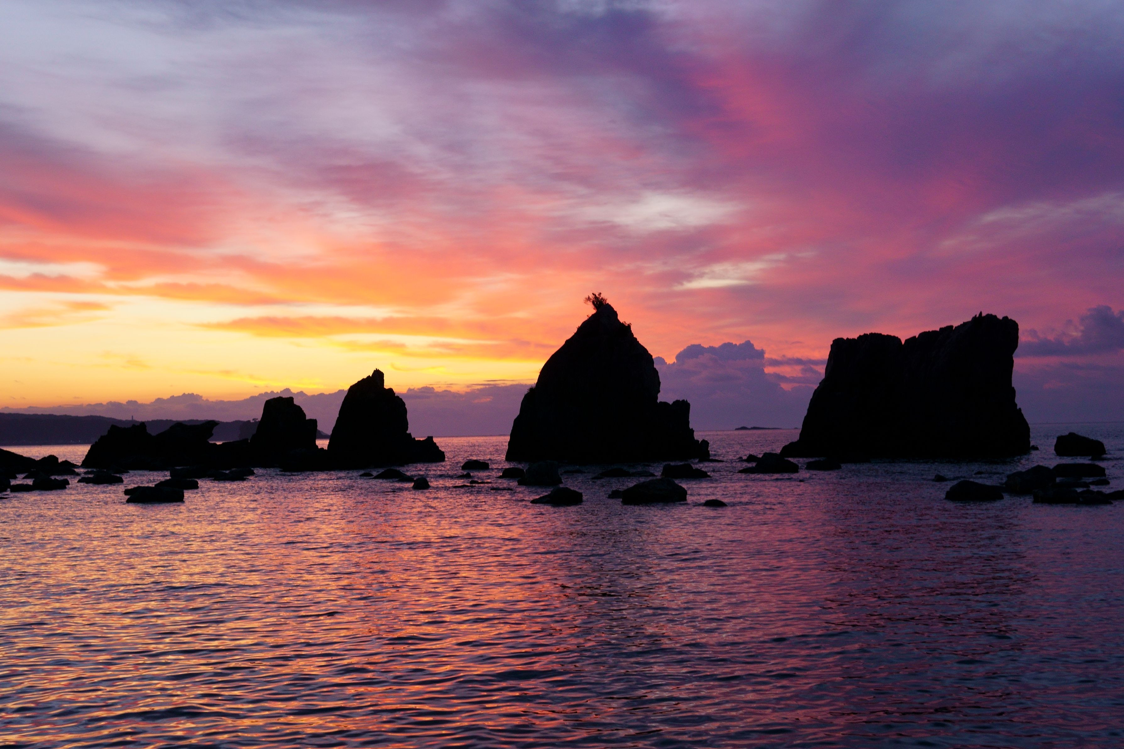 星を撮りたくて南紀に遠征してみました。 雲が多くてしょんぼりしていたのですが、 夜が明け始めると素晴らしい色あいを見せてくれました(^^