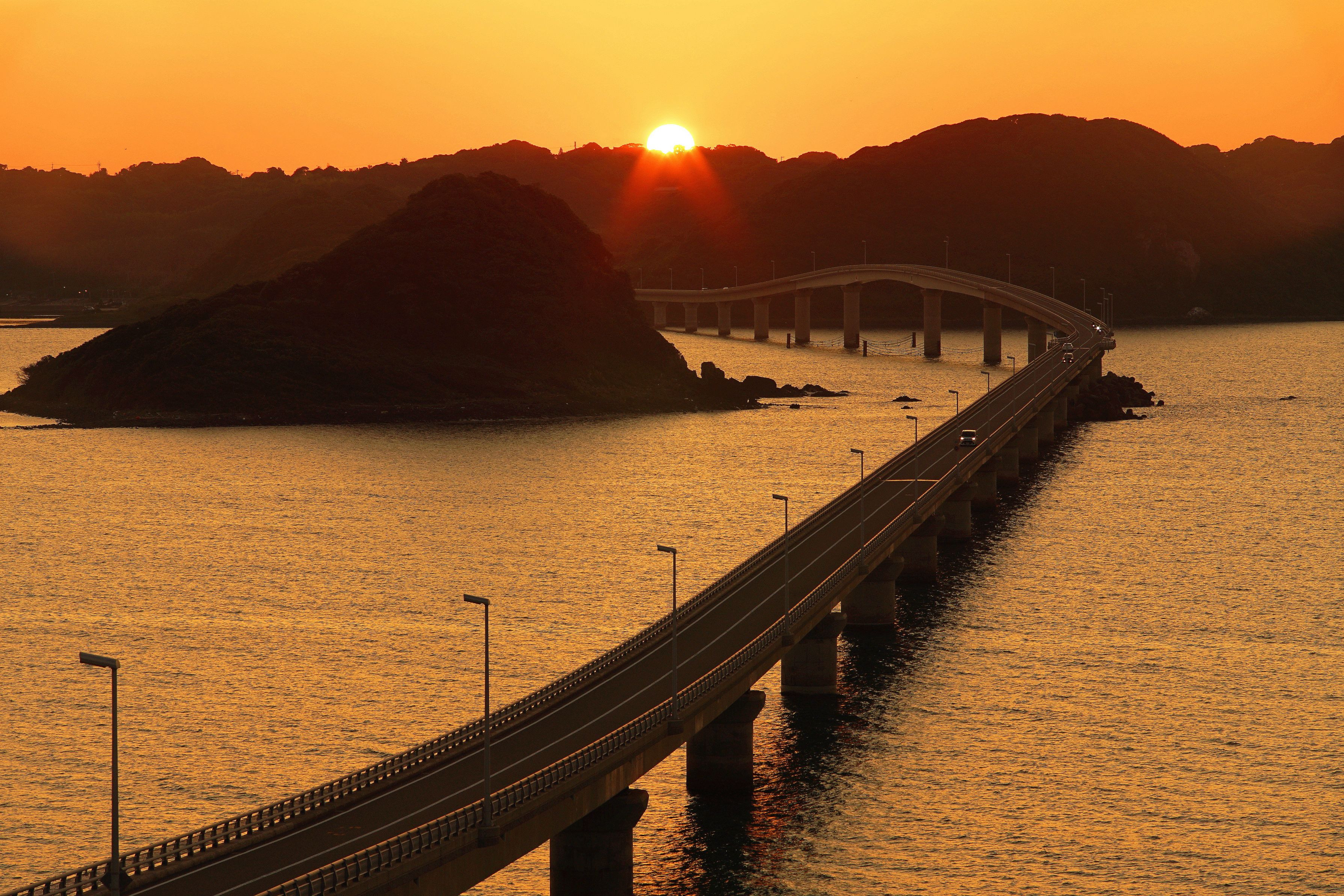 日食後の夕陽が角島の山に沈んで行きました。