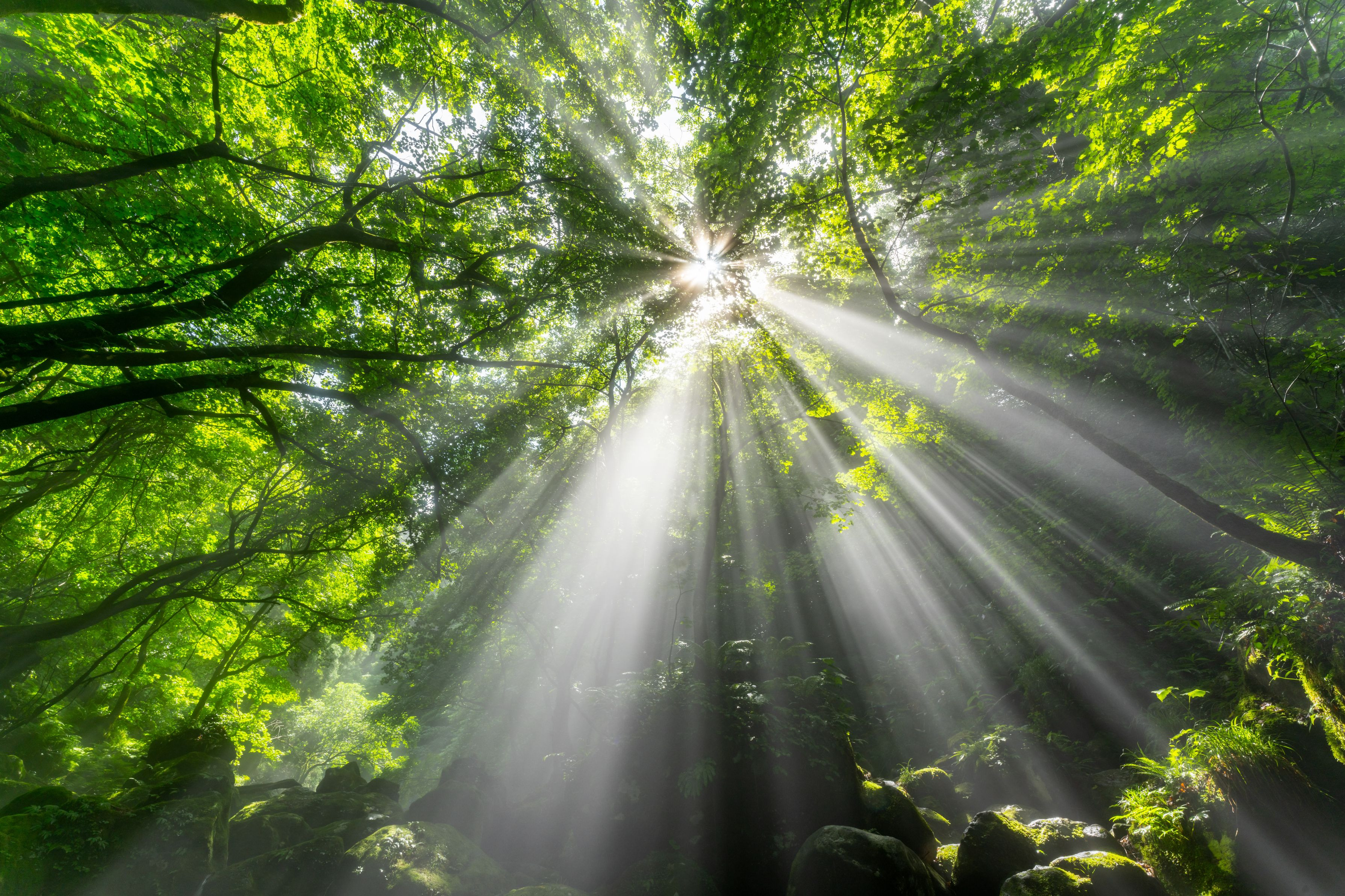 元滝伏流水にて 小雨、川霧が立ち込め見込めない晴れ間を期待してました。 束の間の日差しが木洩れ日の光芒に、ラッキー