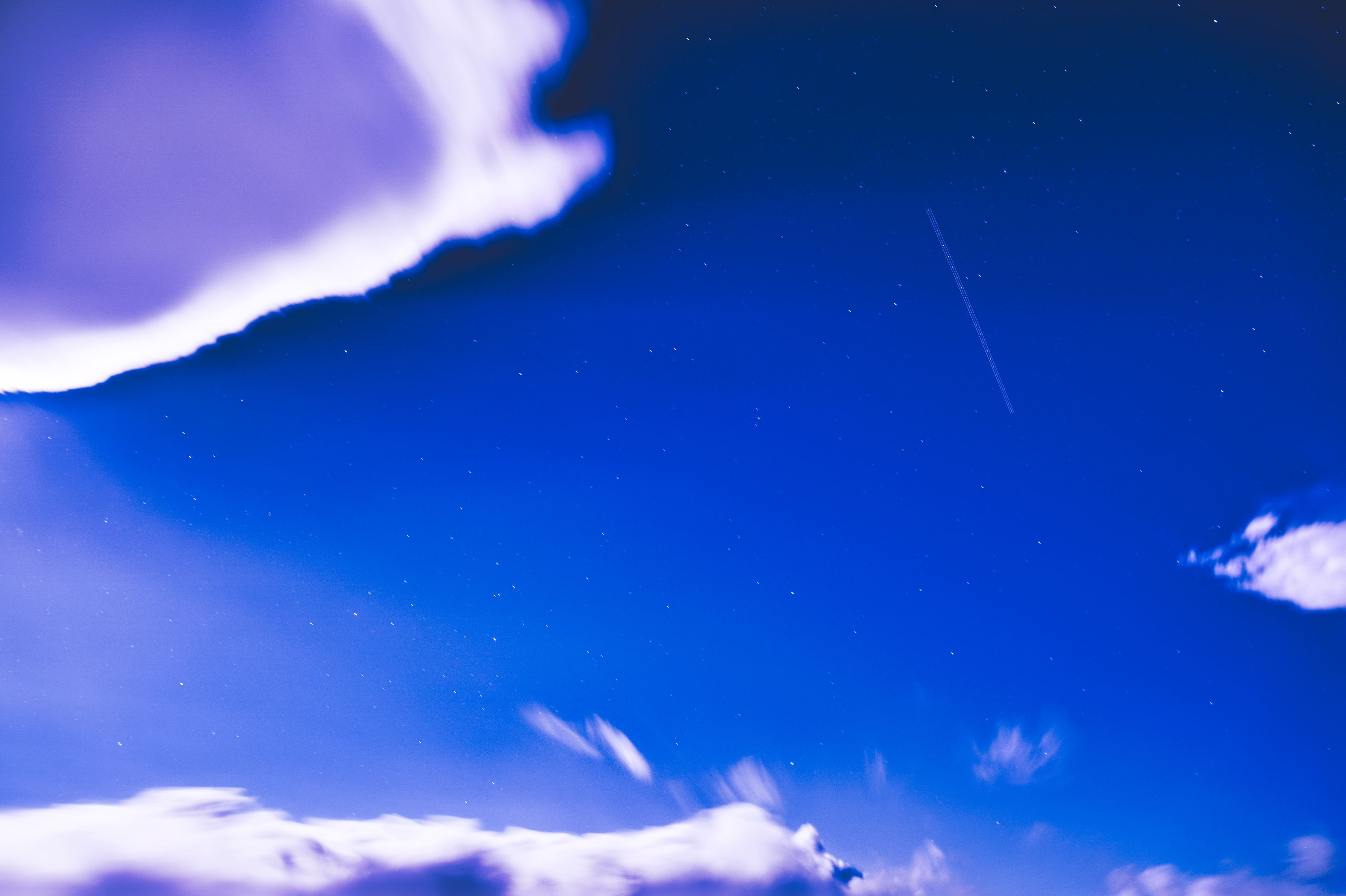 夜雨上がりの夜空に雲の間から星がちらほら 飛行機の軌跡と雲の動きが印象的でした 次回はもっとISO感度を上げて挑戦です
