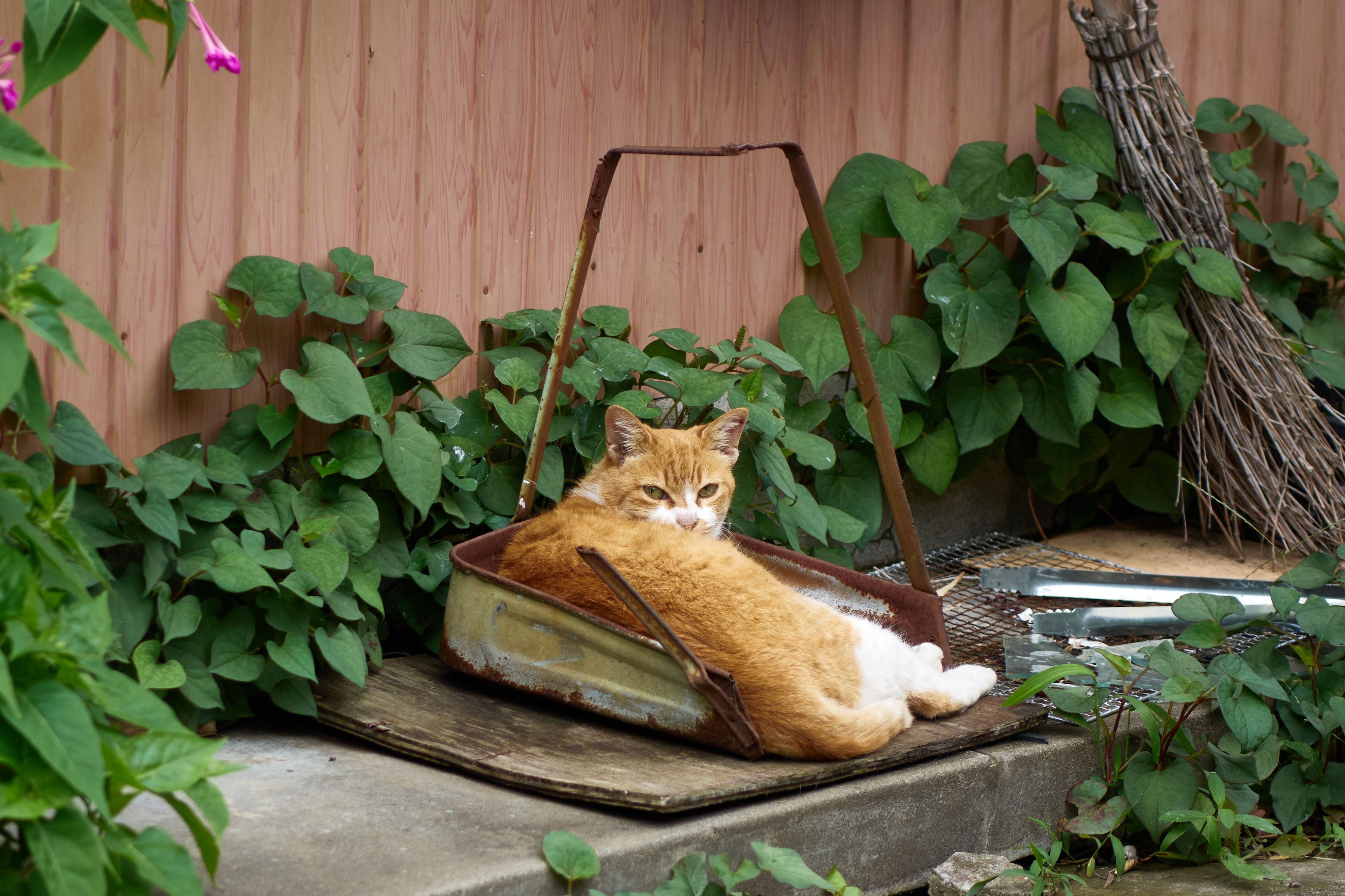 そこで寝て大丈夫? え!なんで? だって、それ、チリトリだよ・・ごみと一緒に捨てられちゃうからね 心配ないよ、此処のご主人は優しいからね、ご飯もくれるし・・ まぁ、おいらの召使みたいなものかな・・ ヤッパリ、ネコさん自由だね(-_-;)