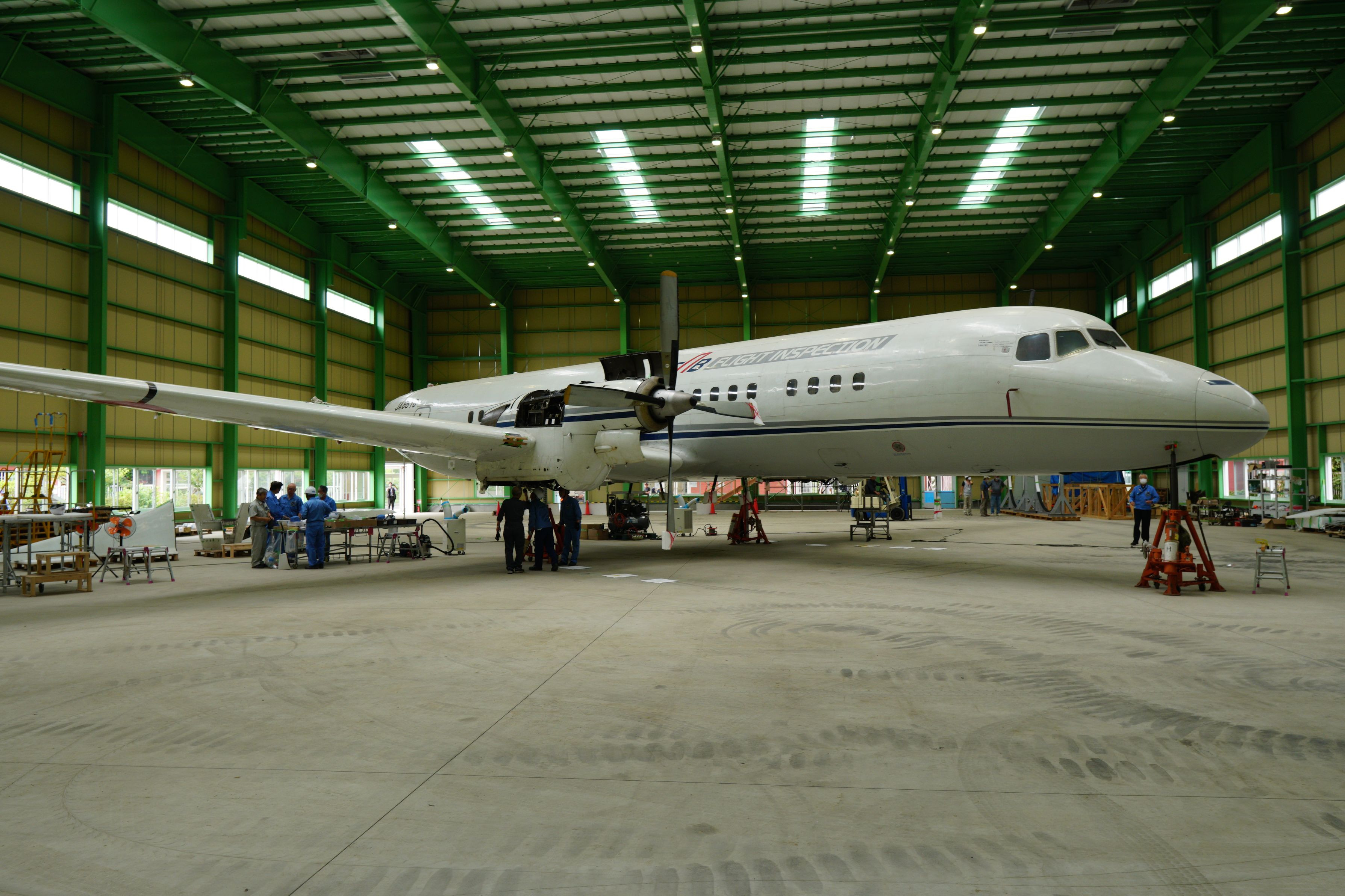 羽田の格納庫から、茨城県筑西市のザ・ヒロサワ・シティに移設され、組み立て中のYS-11量産初号機(JA8610)を見てきました。