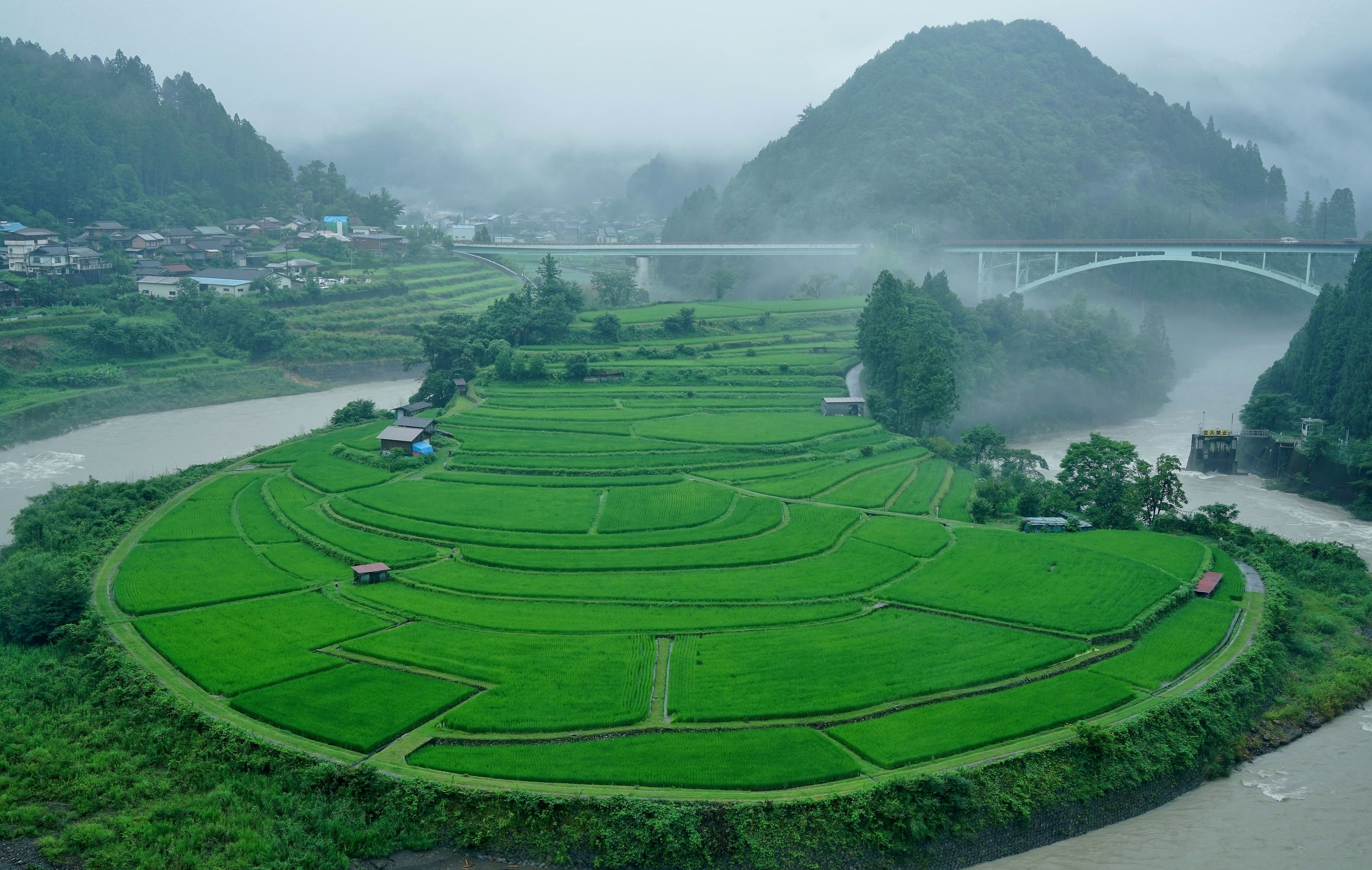 雷、強い雨、ワイパーのハイスピード。梅雨明けが近いのでしょうね。 陸続きなのに「あらぎ島」の棚田です。