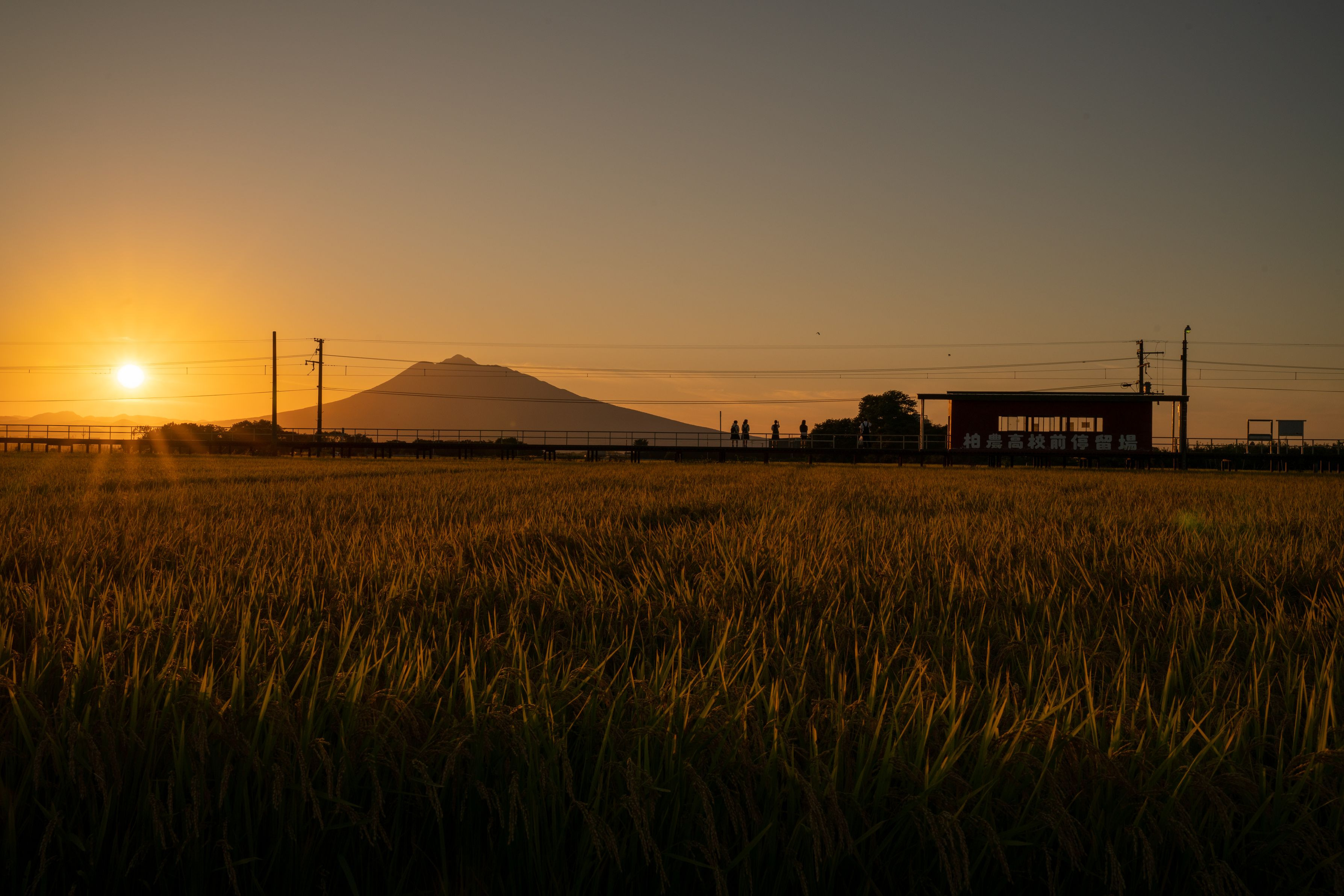 製品情報>My Sony>αcafe>岩木山をバックに黄金稲穂と電車を待つ学生(mko294さん)
