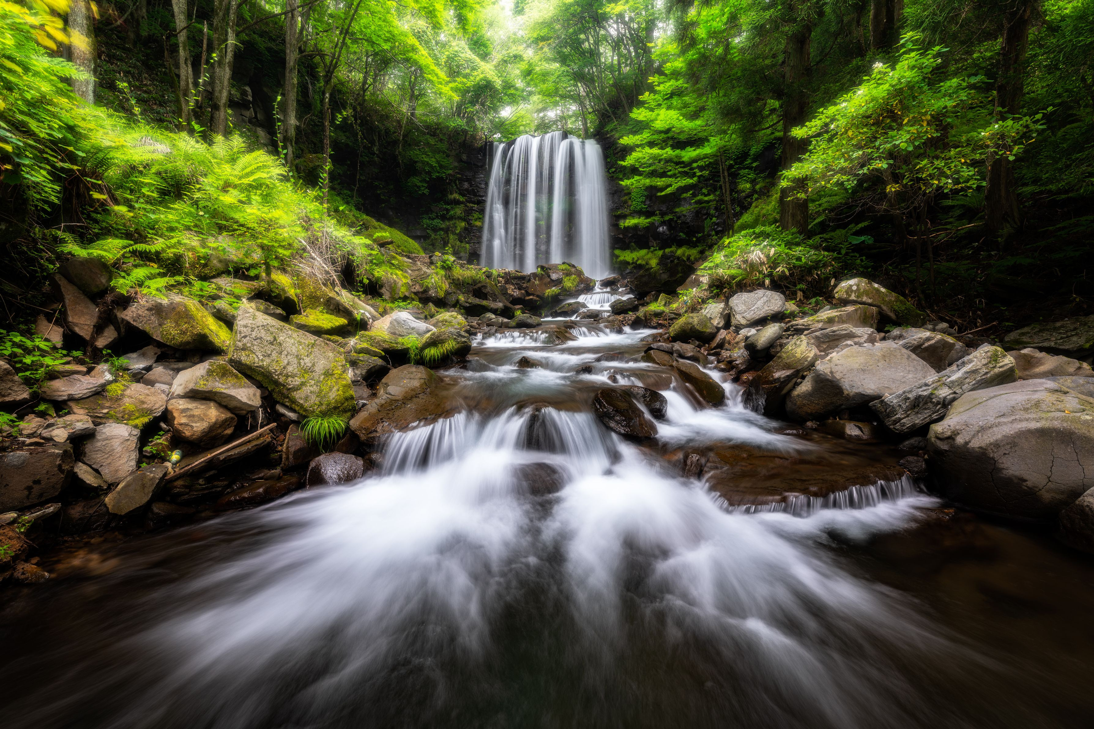 滝のダイナミック差と手前に映る川の流れを広角レンズで撮影しました。