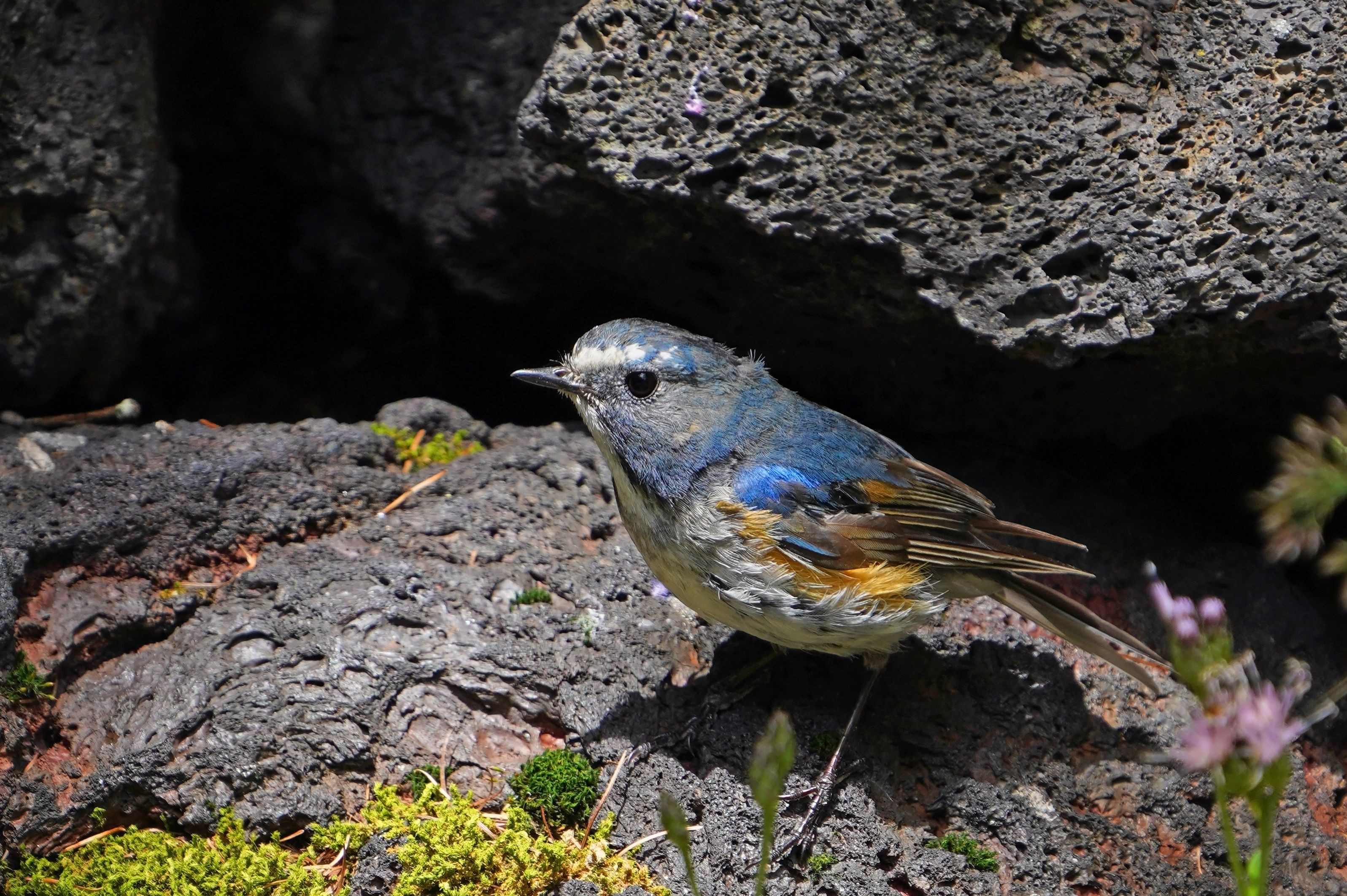 8/12投稿のように#ルリビタキ#さんのオスは全身に青い部分が多いですが、8/16投稿のように生まれて暫くはツブツブさんで尾羽が青いだけです。その後、性的には1年で成熟するそうですが、オスの色が出てくるには2~3年かかり、遅延羽色成熟と呼ばれているそうです。メスや幼鳥に似せることで力の強いオスとの闘争を避ける目的と考えられているそうです。2年目では青の部分も増え、眉斑も白くなってくるみたいです。