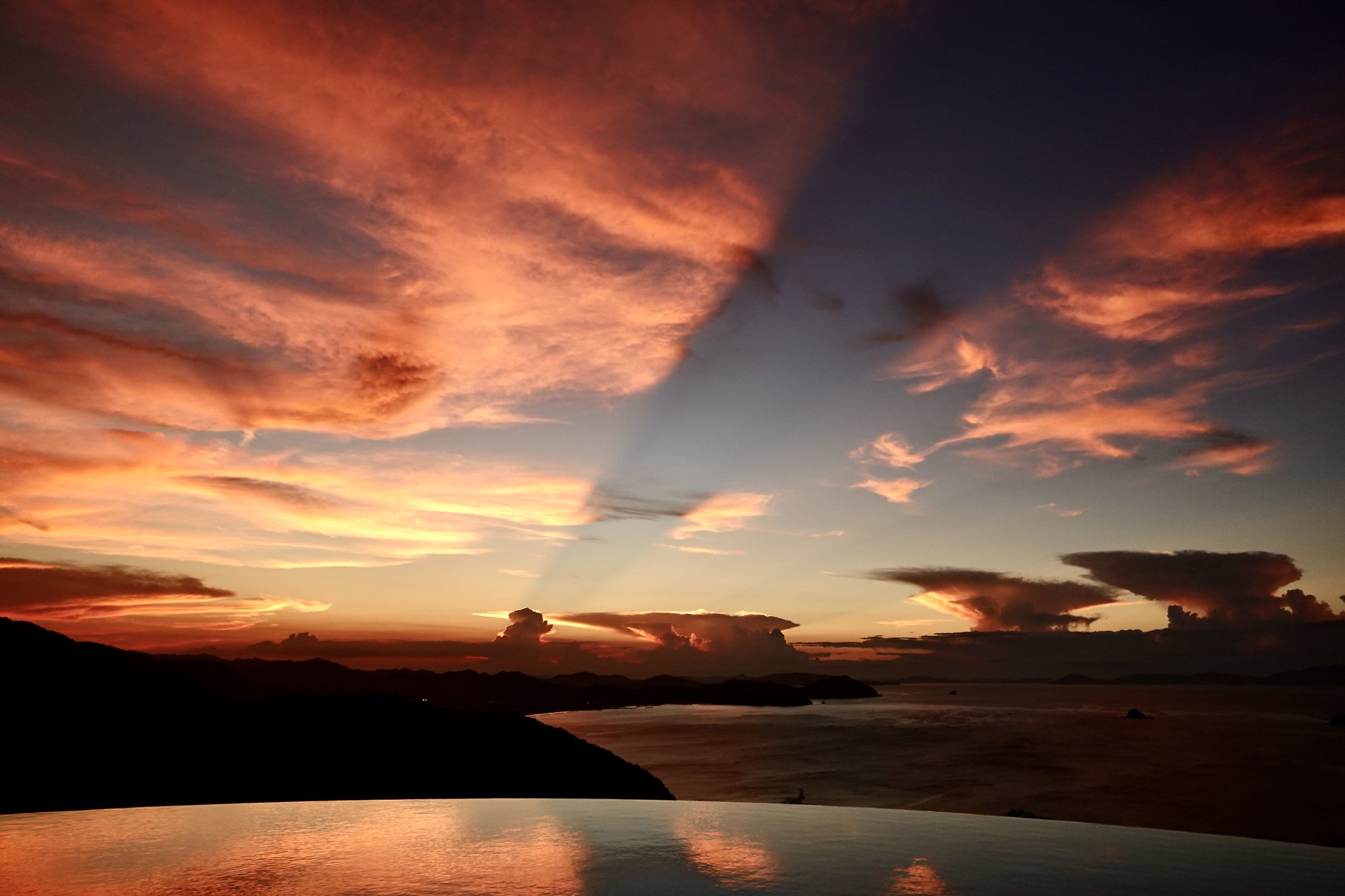 プールサイドからサンセットを見ていたら、太陽が水平線近くの分厚い雲の塊にすっぽり覆われ、細長い一筋の影が形成されました。