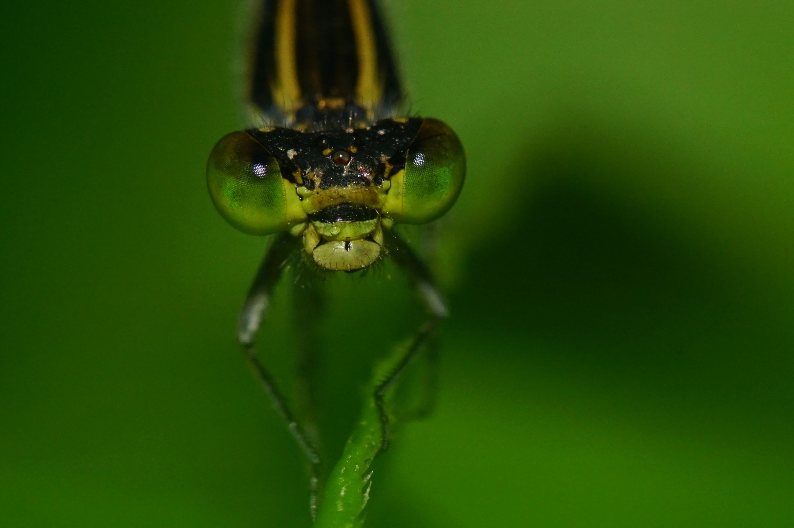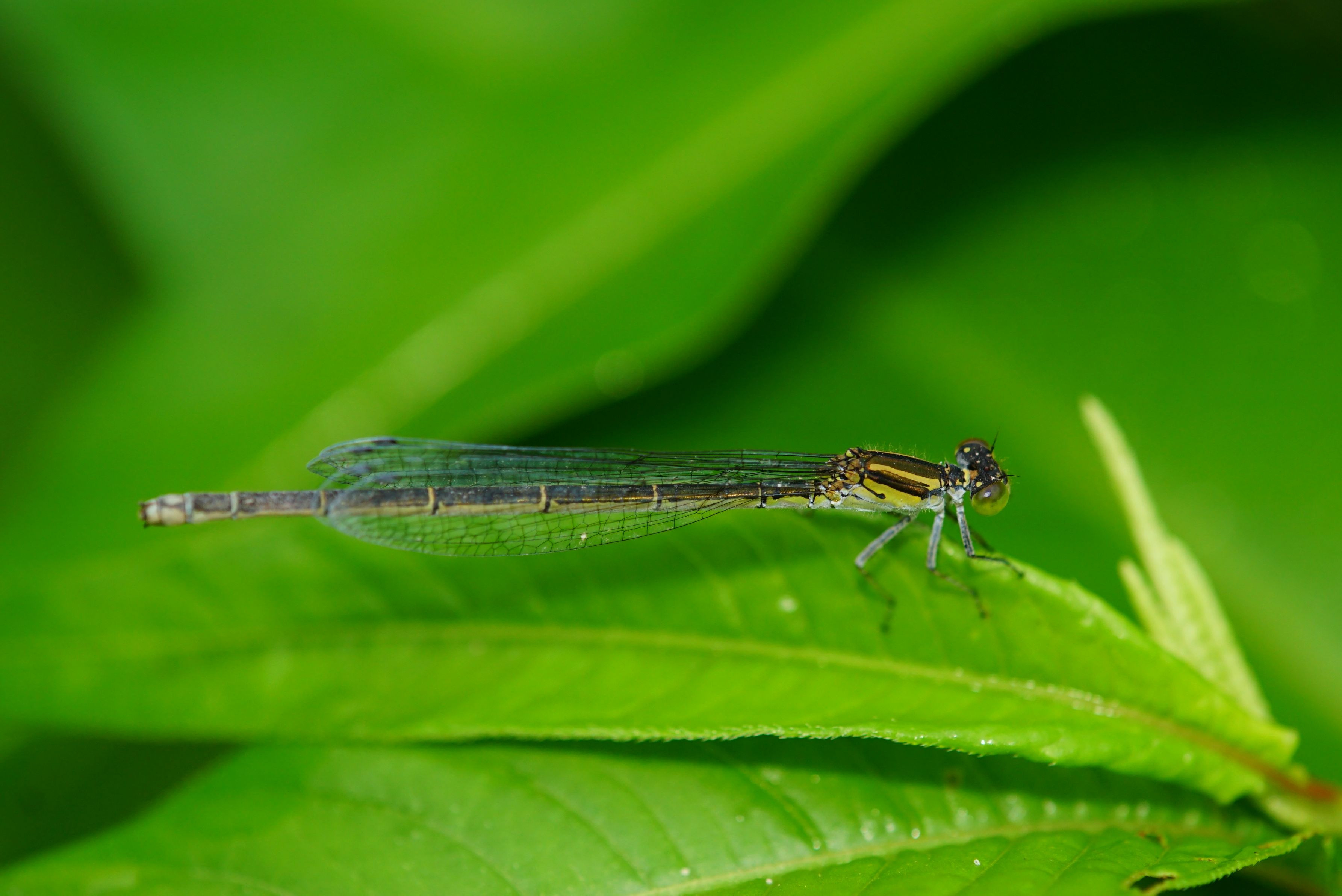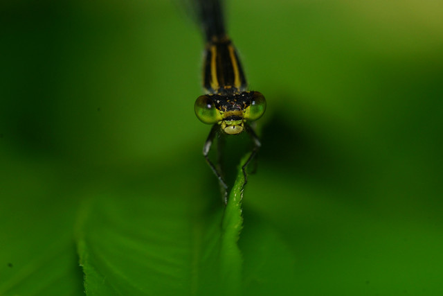 早朝の川の止水域を探索すると、まだ寝ぼけているクロイトトンボのお嬢さんに出会いました。