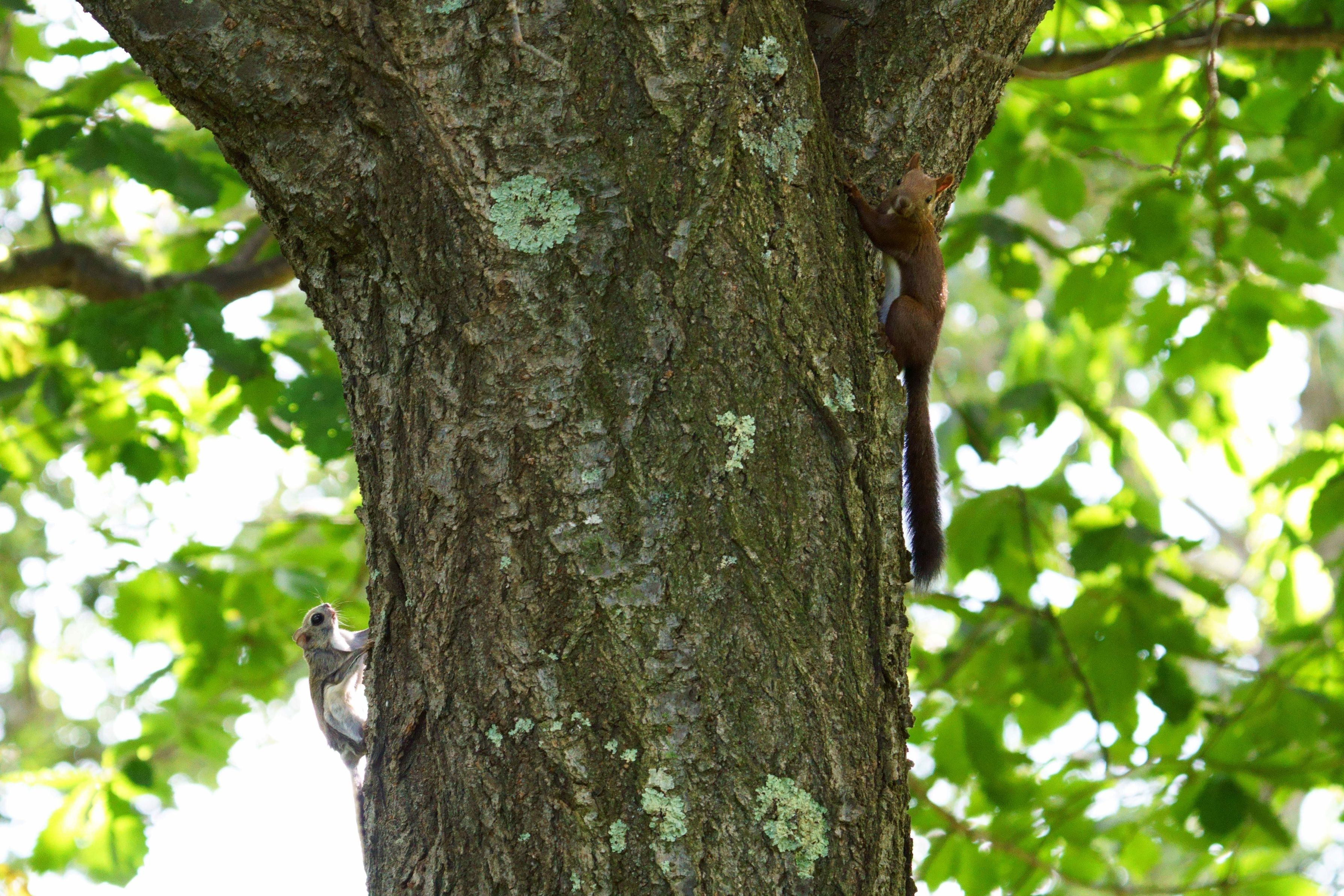 エゾリスがエゾモモンガの巣穴に間違って接近。警戒したエゾモモンガが明るいのに外に出てきて、まさかのツーショット