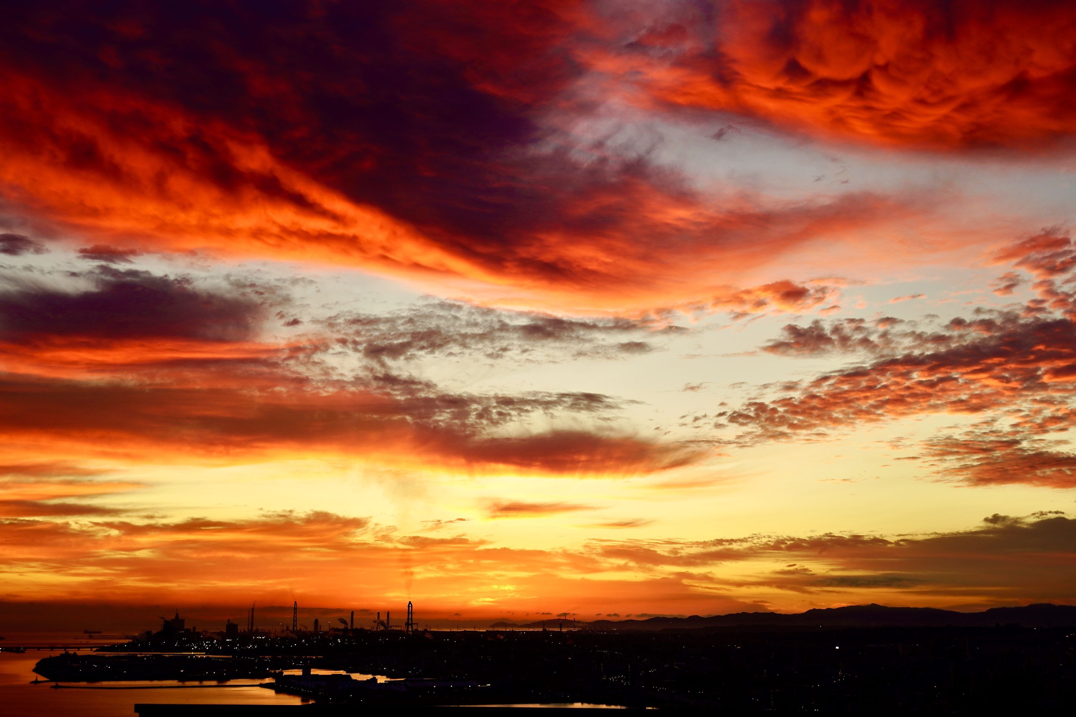 夏の名残りと秋を感じさせる雲が交差し紅色からオレンジ色に代わりながら朝日の登場を演出しているようでした。