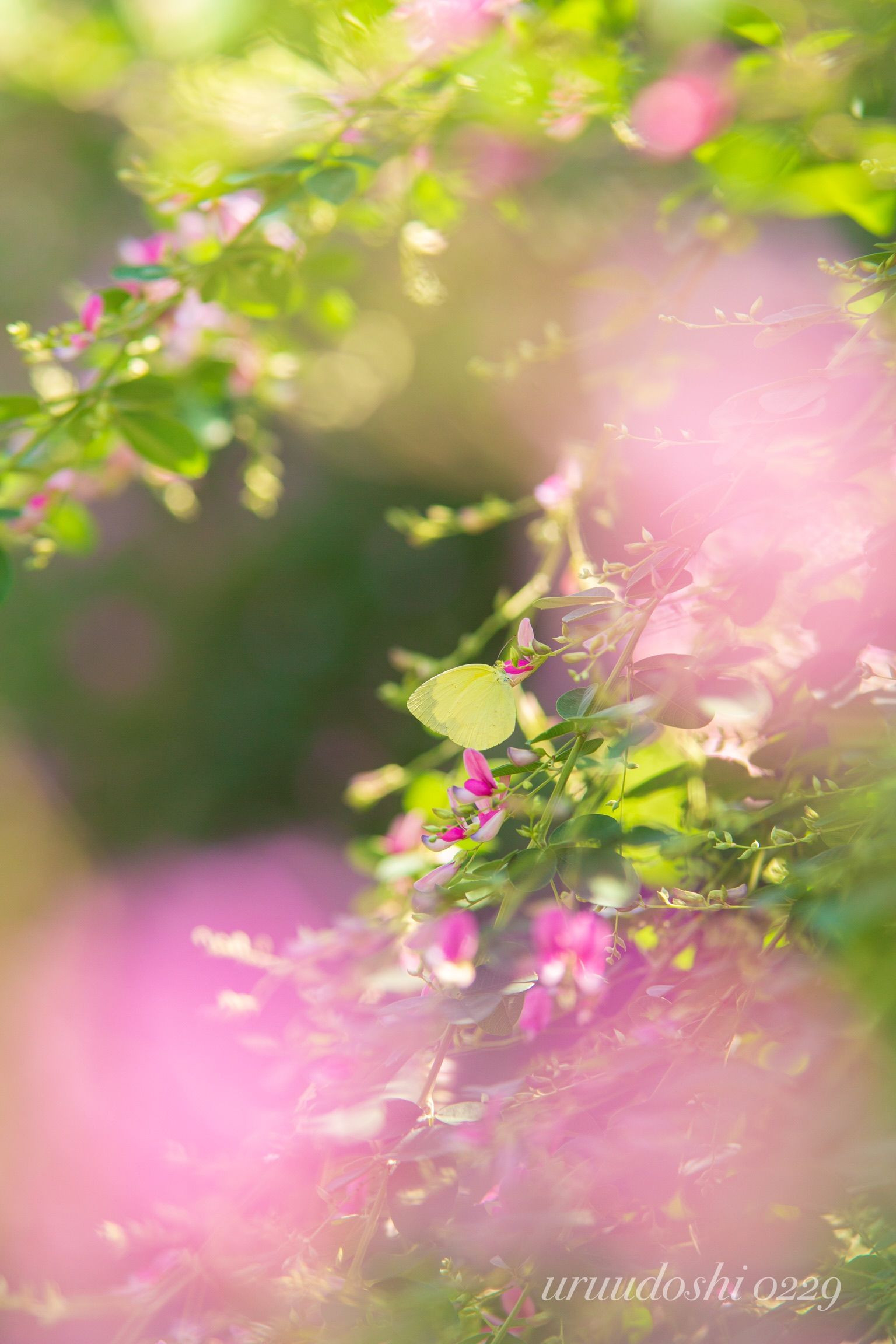京都の街中にある寺院の境内に咲き誇る秋萩。 どこからともなく、黄色い蝶が訪れて朝日の射す萩に止まってくれました。