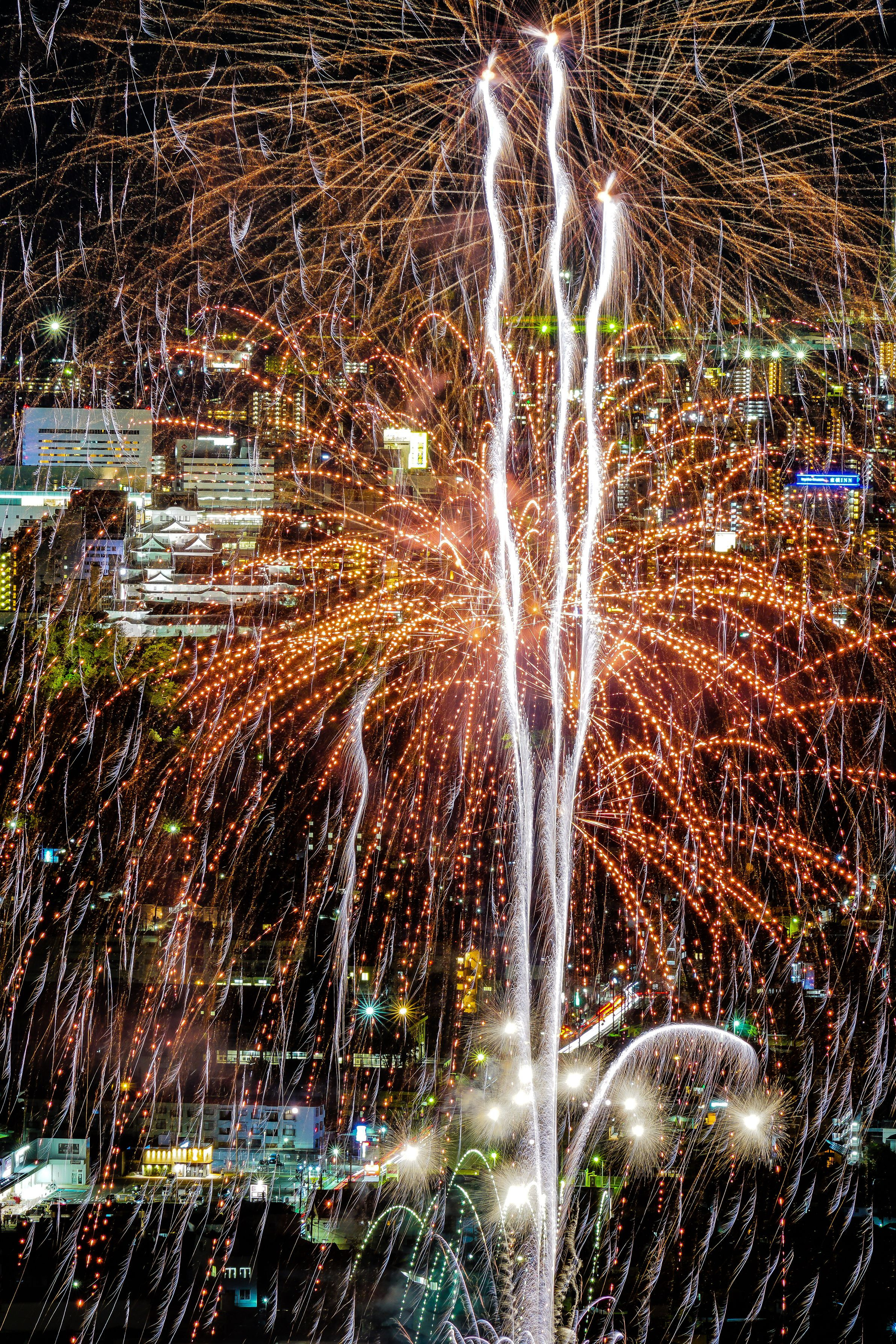 姫路城を背景に花火を撮影しました。