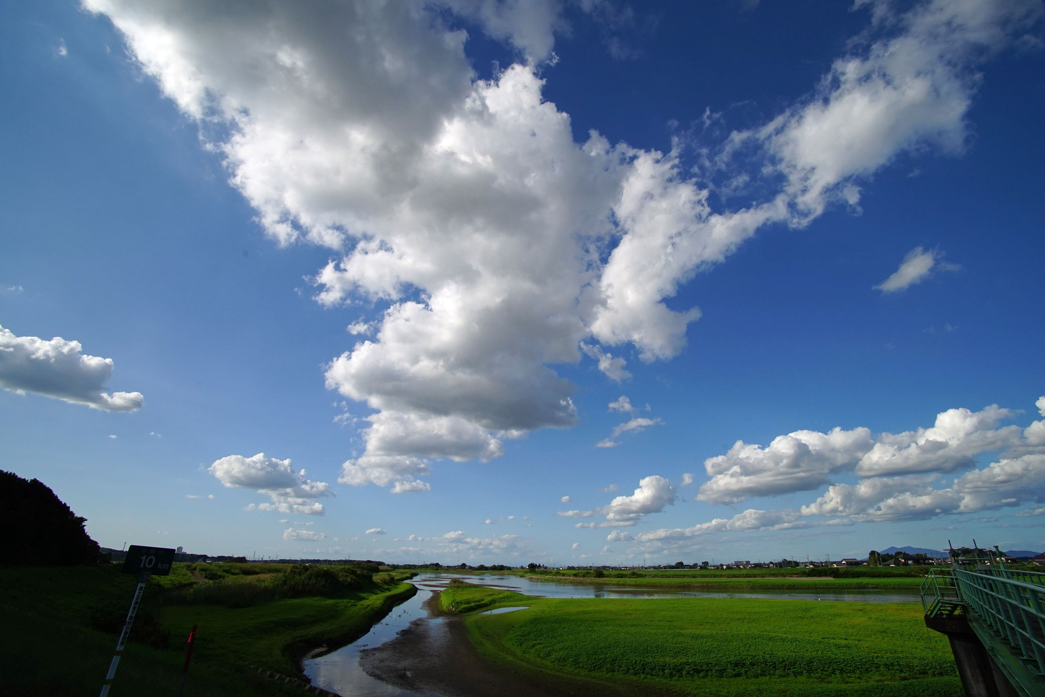 小貝川岡堰のちょっと手前上流側です。中洲状になっていて、サギがいます。見上げると青空に白い雲、秋だなあと感じます。右手に小さく見えるのは、筑波山です。