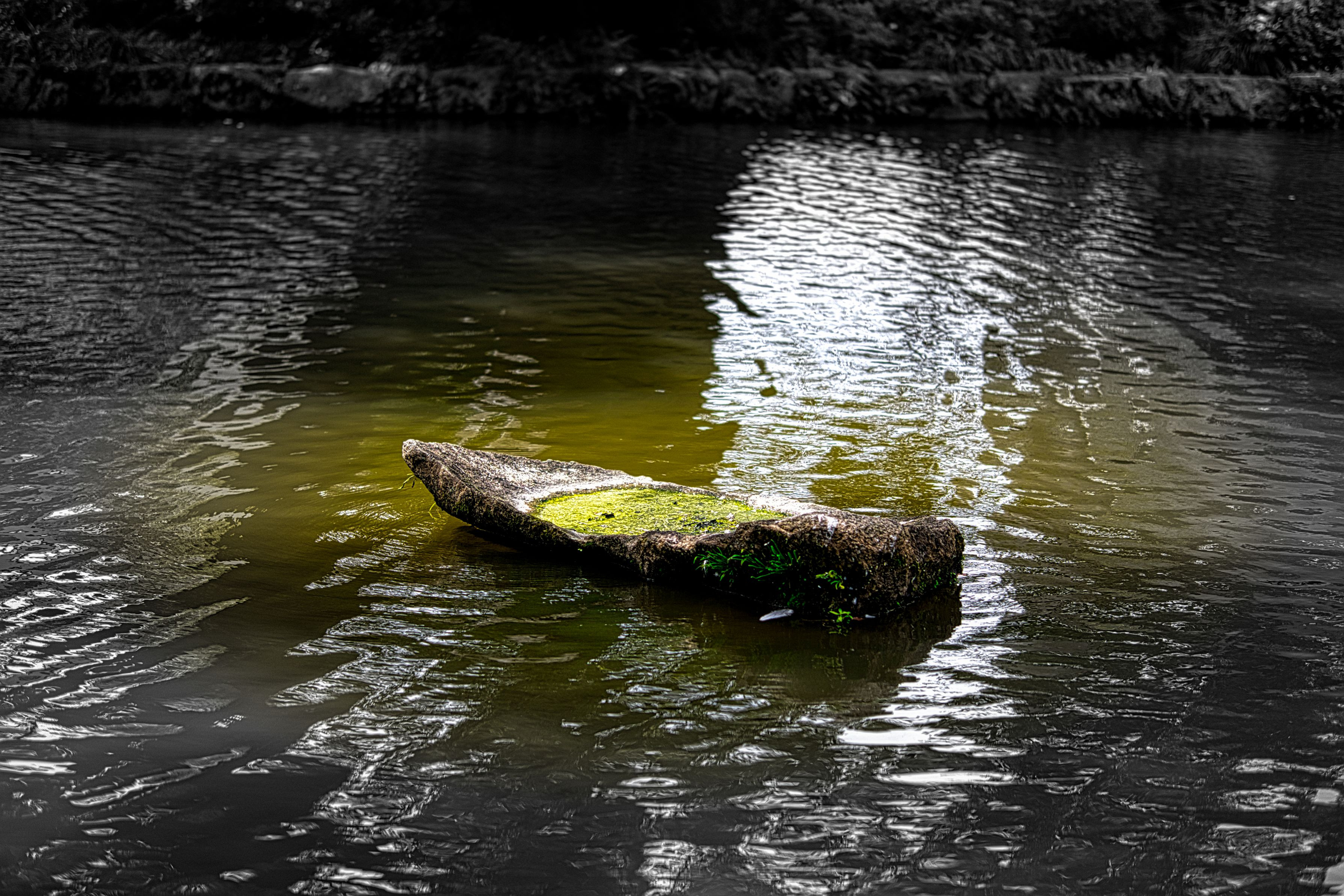 岩島(がんとう)「池周辺の石組と関連をもって、1石または数石、池の中に配置された岩の島」だそうです。 岩の窪みに水が溜り、水苔が浮かぶ。日本の美を感じました。