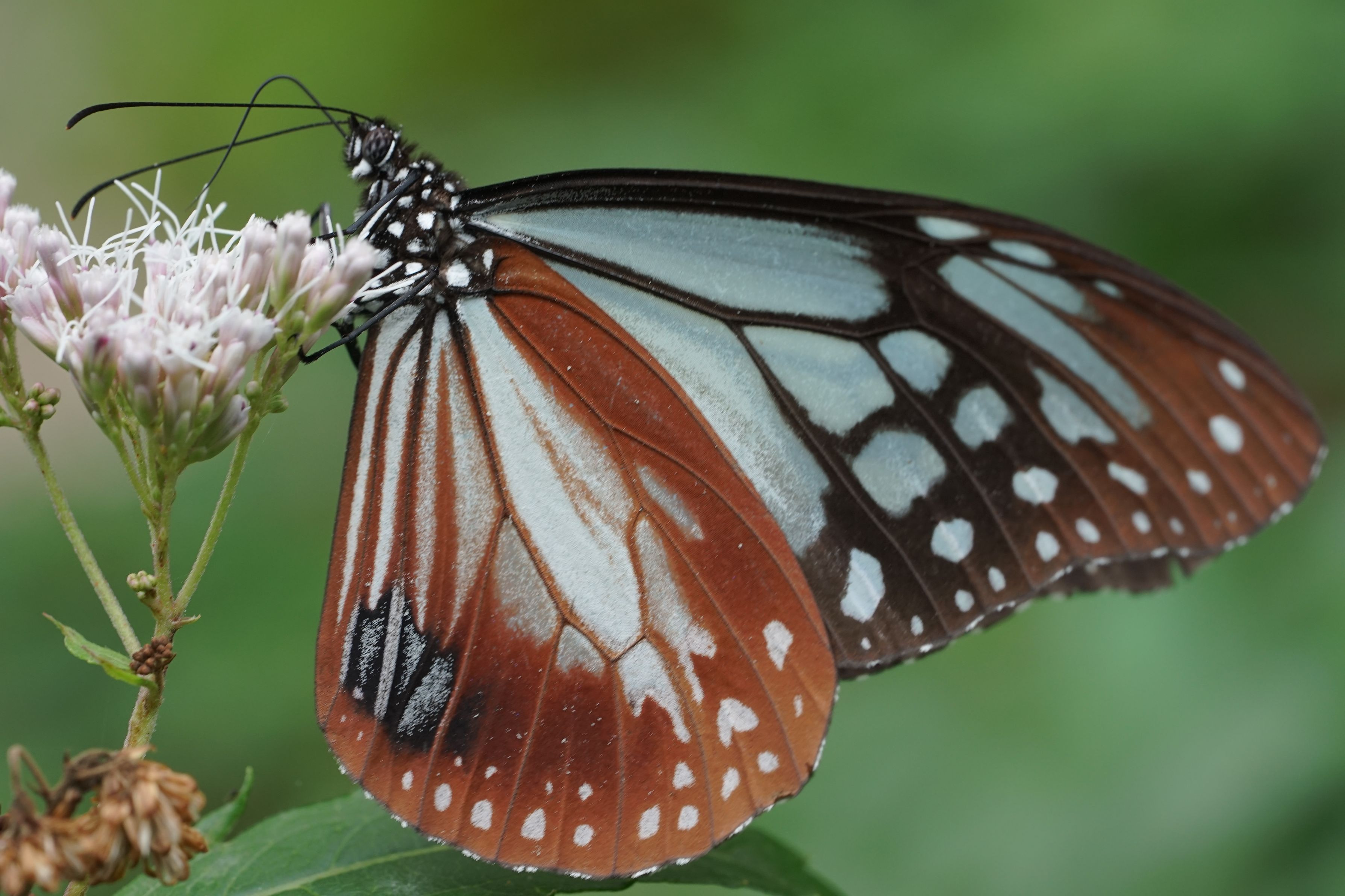そろそろアサギマダラが飛来する頃だな、と淡い期待を胸に撮影場所に向かったがフジバカマの開花が進んでおらず蝶の姿を見ることはなく、あきらめて他の写真を適当に撮って帰ろうとしたところ、開花したフジバカマが一叢だけあったのでしばらくそこにいたら、突然目の前に一頭のアサギマダラがどこからともなくやってきてひらひらと頭のまわりを舞い始めた。今シーズン初の邂逅を無事に果たせた。