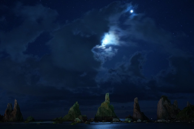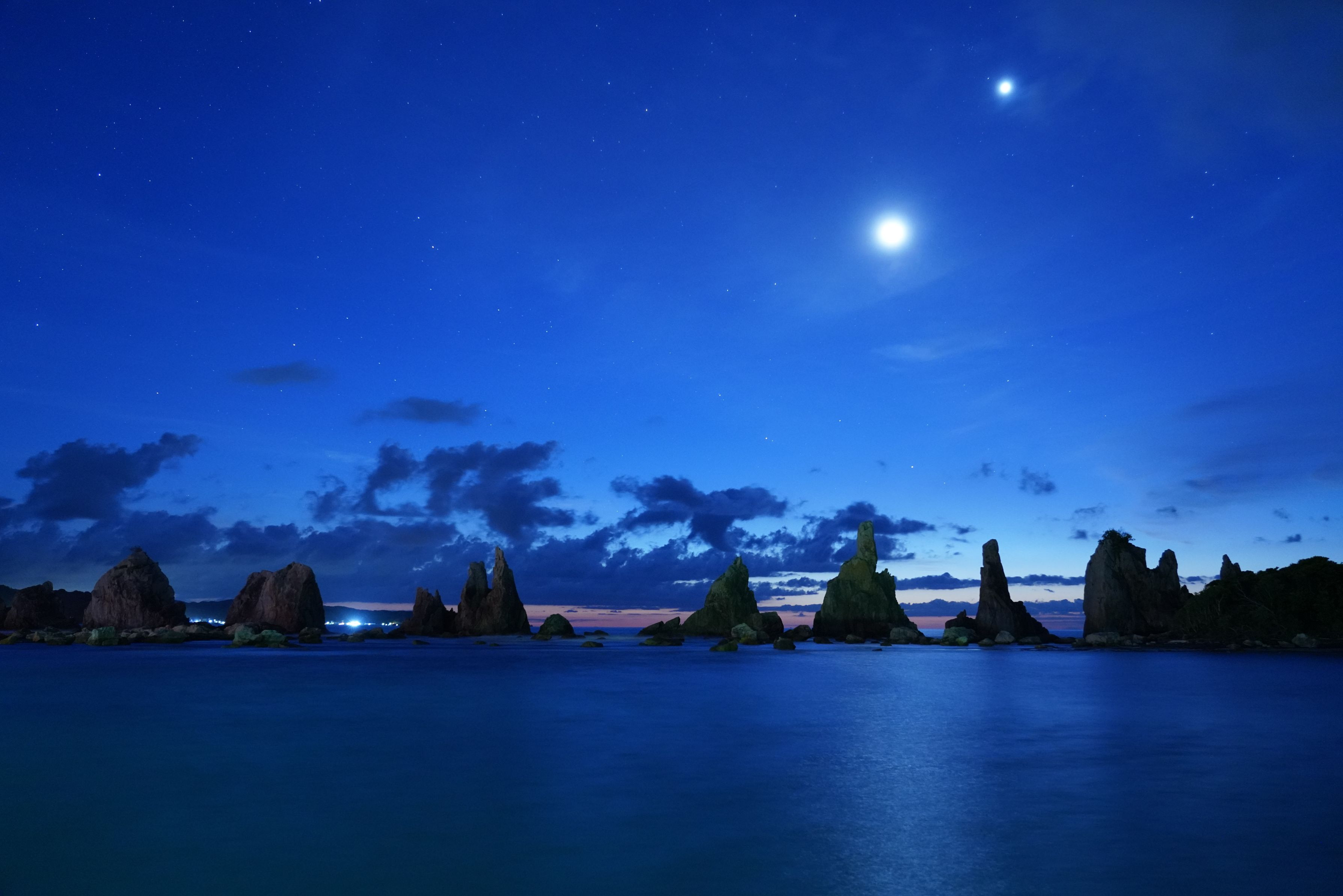橋杭岩を照らす月と金星