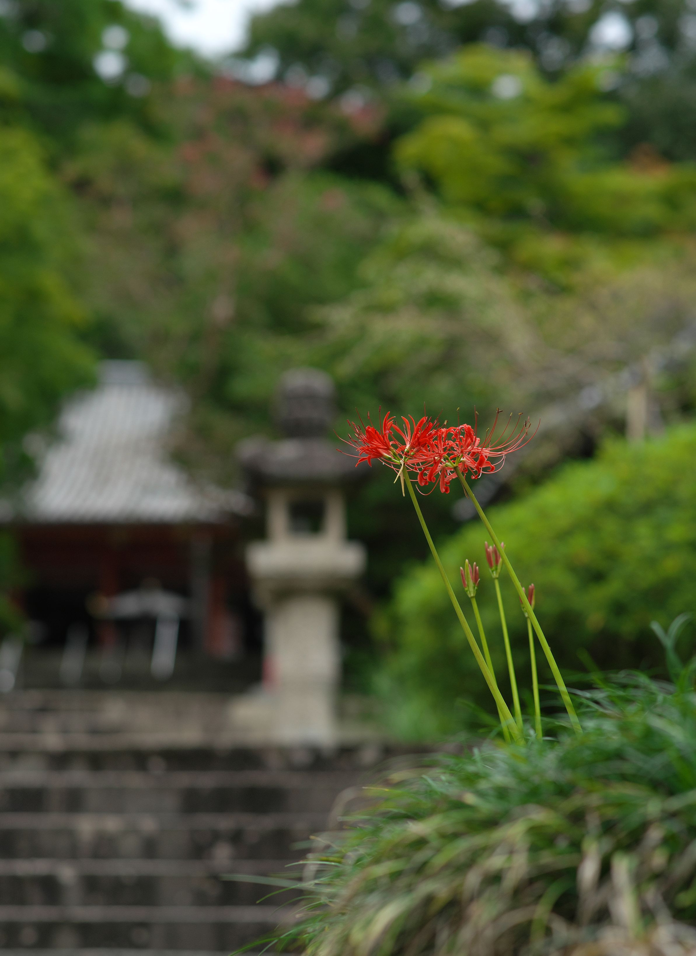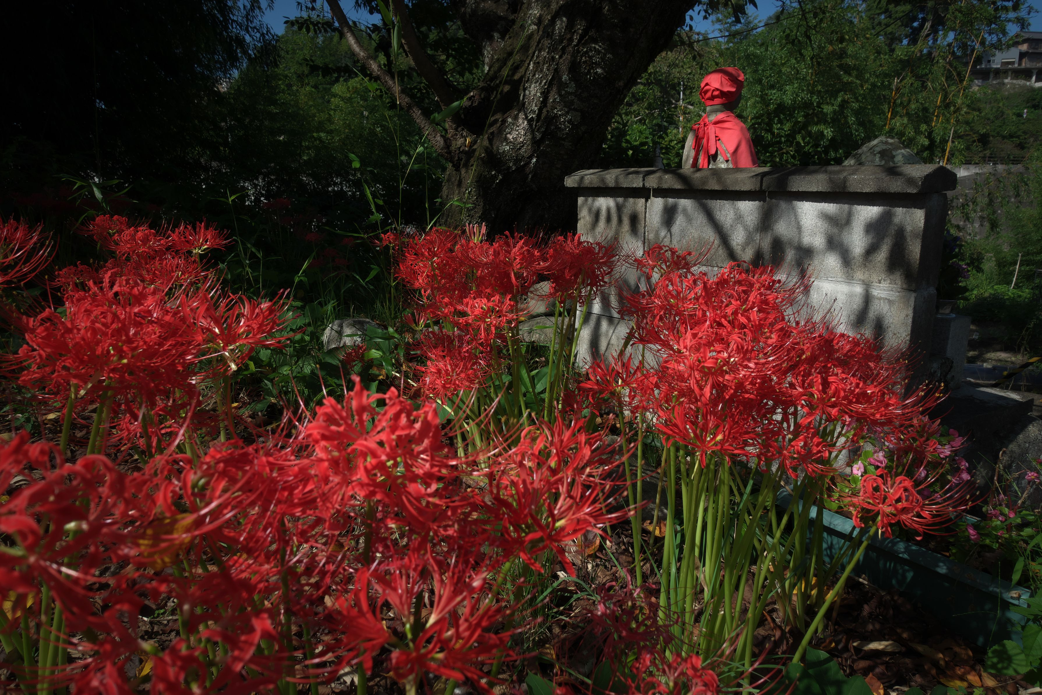 お寺とお地蔵さんのそばで咲く彼岸花を撮ってきました。