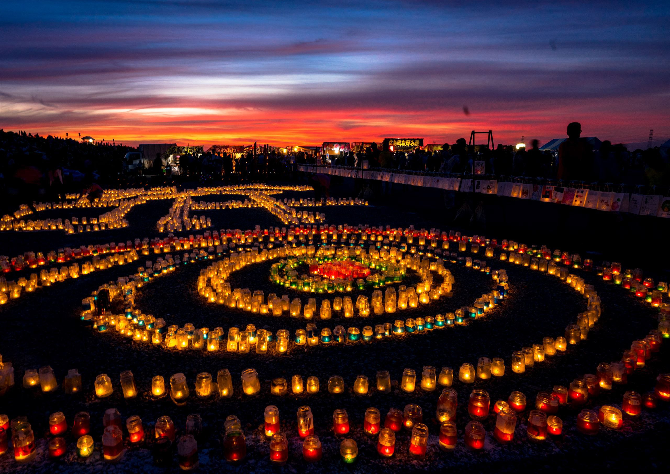 夕焼けをバックに無数のキャンドルがアートを描きます 栄町花火大会前のキャンドル・イベントです