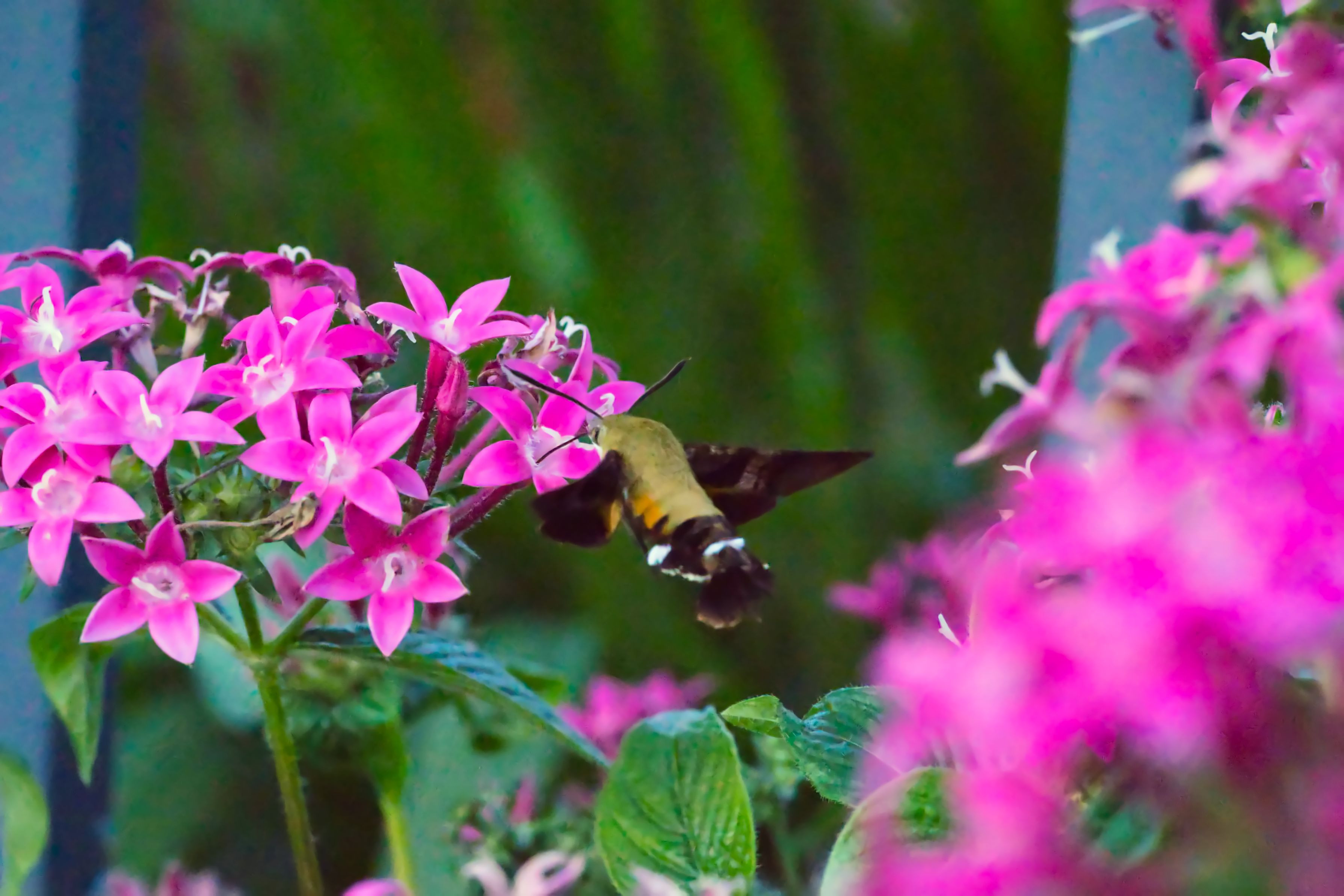 偶然にも50cmほどの距離でこの写真を撮れる機会に恵まれたにもかかわらず、気づかない間に手が当たっていたのかISO感度が最高値に切り替わっていたため、ホウジャクを撮った写真は全て全滅・・・・ ツールで補正を試みたけどこれが限界。ISO感度設定、せめて一定値以上は変更の際に確認を求めるようにして欲しいな・・・
